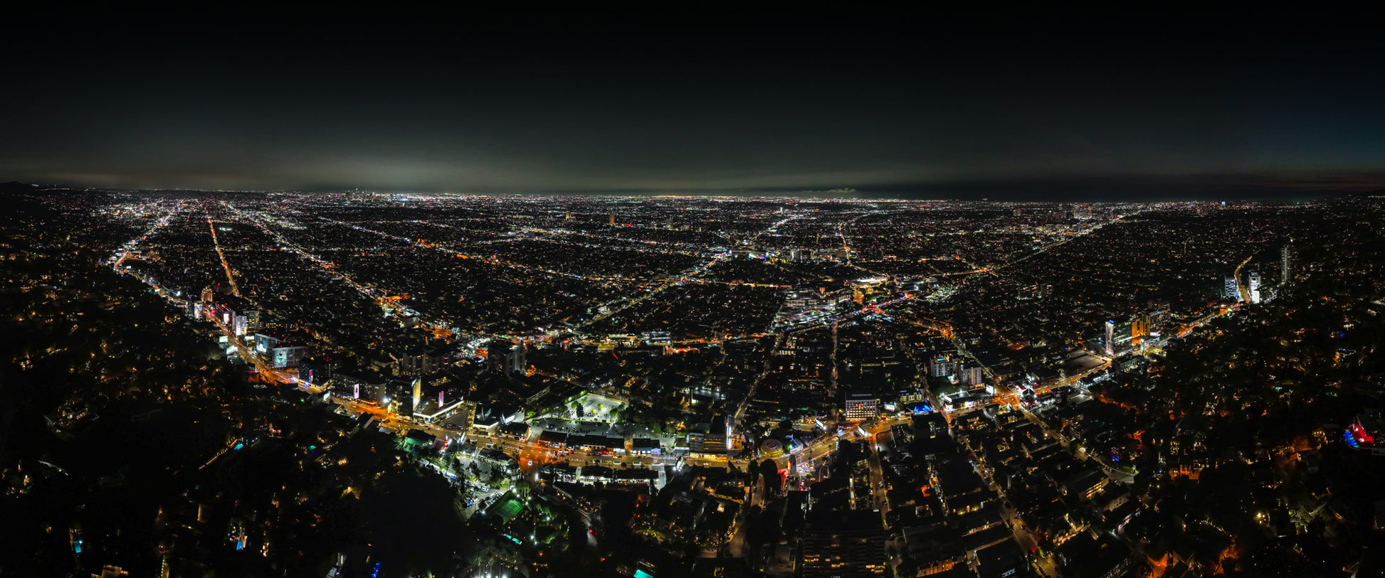 "City of Stars: Twilight's Embrace on Sunset Boulevard" is a mesmerizing aerial panorama that unveils the mystical charm of Los Angeles from above Sunset Blvd. In this captivating view, the city's lights converge to create a breathtaking tapestry. To the left, Hollywood Blvd sparkles like a legendary boulevard of dreams, while on the right, the nightlights of West Hollywood paint a vivid portrait of urban allure. In the distance, downtown Los Angeles glows with ambition, casting its celestial aura. This image is a symphony of lights, where each street is a luminous thread in the city's rich fabric, inviting you to explore the twilight's embrace of the City of Stars.