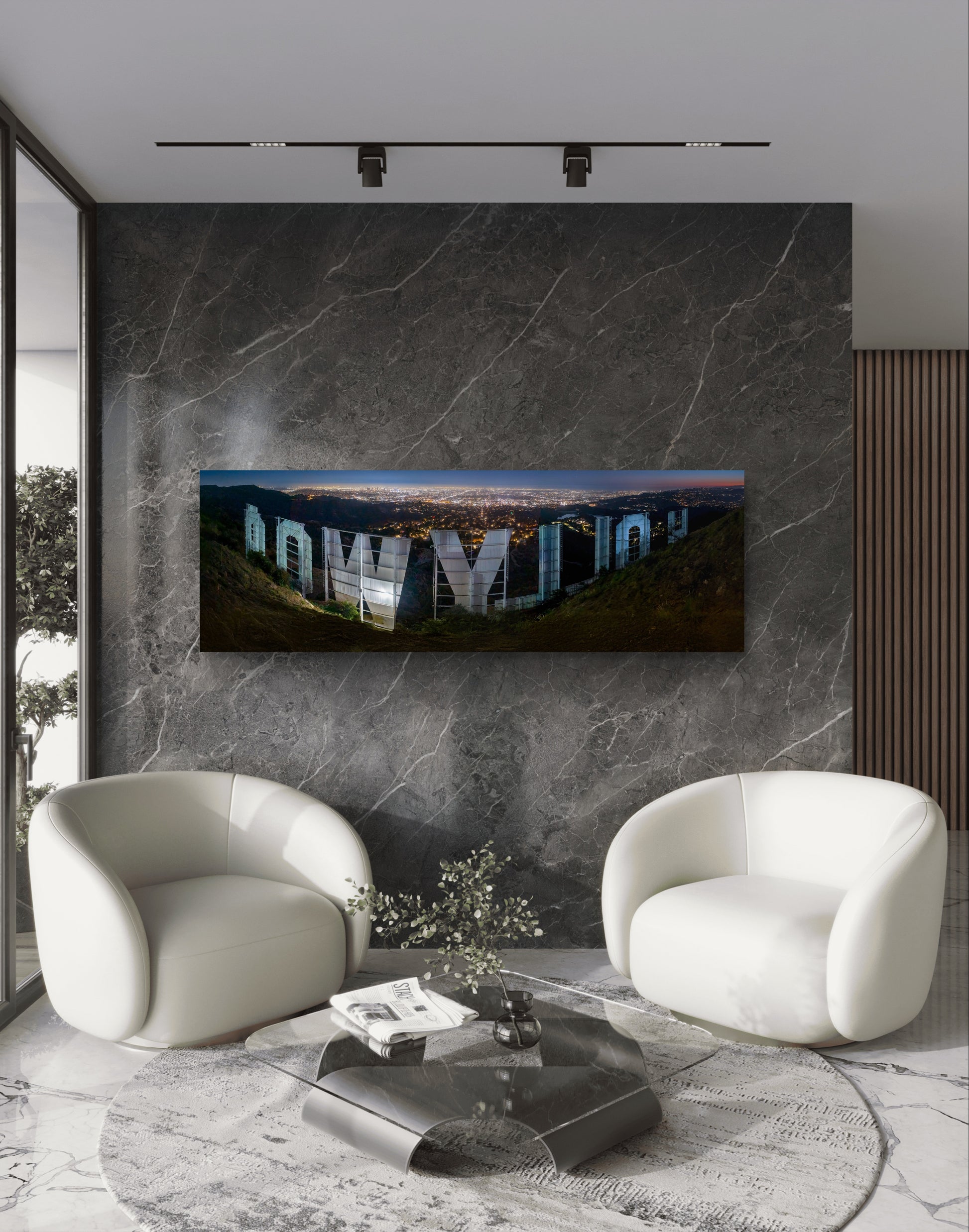 In a home or office, this piece adds a bold statement of Los Angeles’ cultural allure and vibrant energy. Perfect for creative spaces or urban-inspired interiors, the artwork evokes the mystique of Hollywood and the endless possibilities the city represents. For home settings, it serves as a conversation piece, bringing a touch of cinematic flair to a living room or study. In an office, the image can inspire ambition and creativity, reminding viewers of LA’s iconic status as a global hub for dreams and innovation.