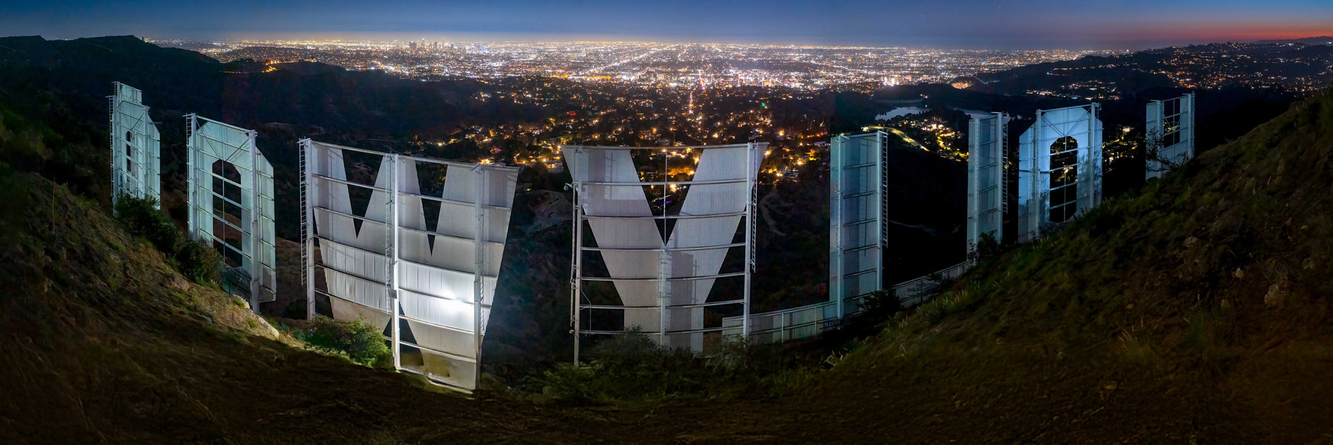 The image presents a panoramic, twilight view from behind the iconic Hollywood Sign, looking out over the sprawling cityscape of Los Angeles. The sign's massive white letters, a symbol recognized worldwide, are backlit and framed by the rugged terrain of the Hollywood Hills. The viewpoint allows for a unique perspective, where the letters themselves are a structural component of the foreground, contrasting against the glittering urban expanse below. As night falls, the city transitions into a tapestry of lights, with the dense concentration of illumination hinting at the vibrancy of life in the metropolis. The sky, a gradient from the darkening blue of night to the warm remnants of sunset, adds a dramatic backdrop to the scene, further emphasizing the city's moniker as the "City of Dreams."