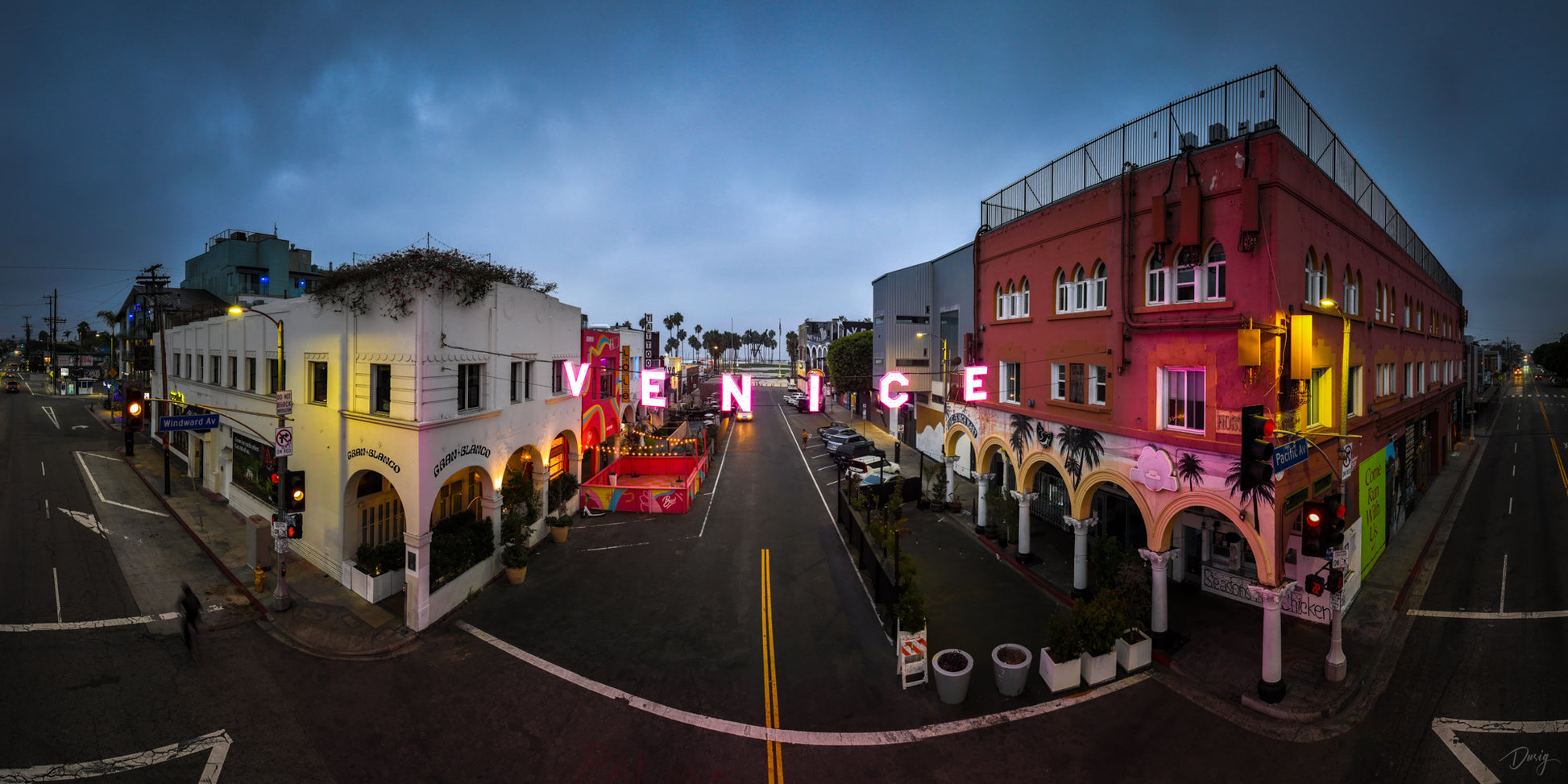 Daybreak's Palette: Awakening the Venice Sign's Brilliance captures a rare, tranquil moment on Windward Avenue as dawn begins to break over Venice Beach. The iconic Venice sign glows in vibrant neon pink, casting a warm and inviting light across the quiet, empty street. The surrounding buildings, painted in soft, muted hues, reflect the early morning glow, adding a subtle charm to the scene. Above, the sky is still blanketed in the deep blue tones of early morning, hinting at the peacefulness before the bustling energy of the day begins.