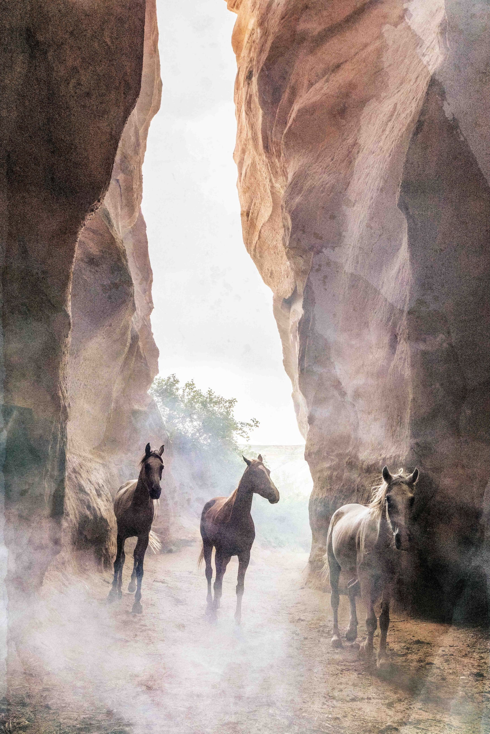 Emerging through veils of mist and sandstone, three horses stand in silent formation within a narrow canyon in Cappadocia, Turkey—a land where history and geology converge in surreal beauty. The early morning light cascades down the chiseled rock walls, highlighting the natural majesty of both the terrain and the animals. Their poised stillness echoes a sense of ancient guardianship, as if they’ve been watching over this sacred space for centuries.
