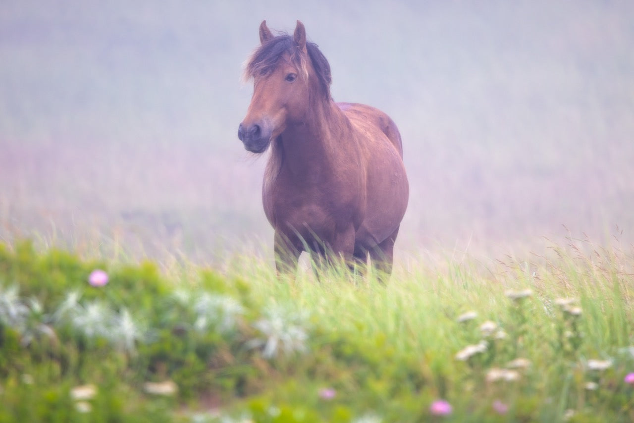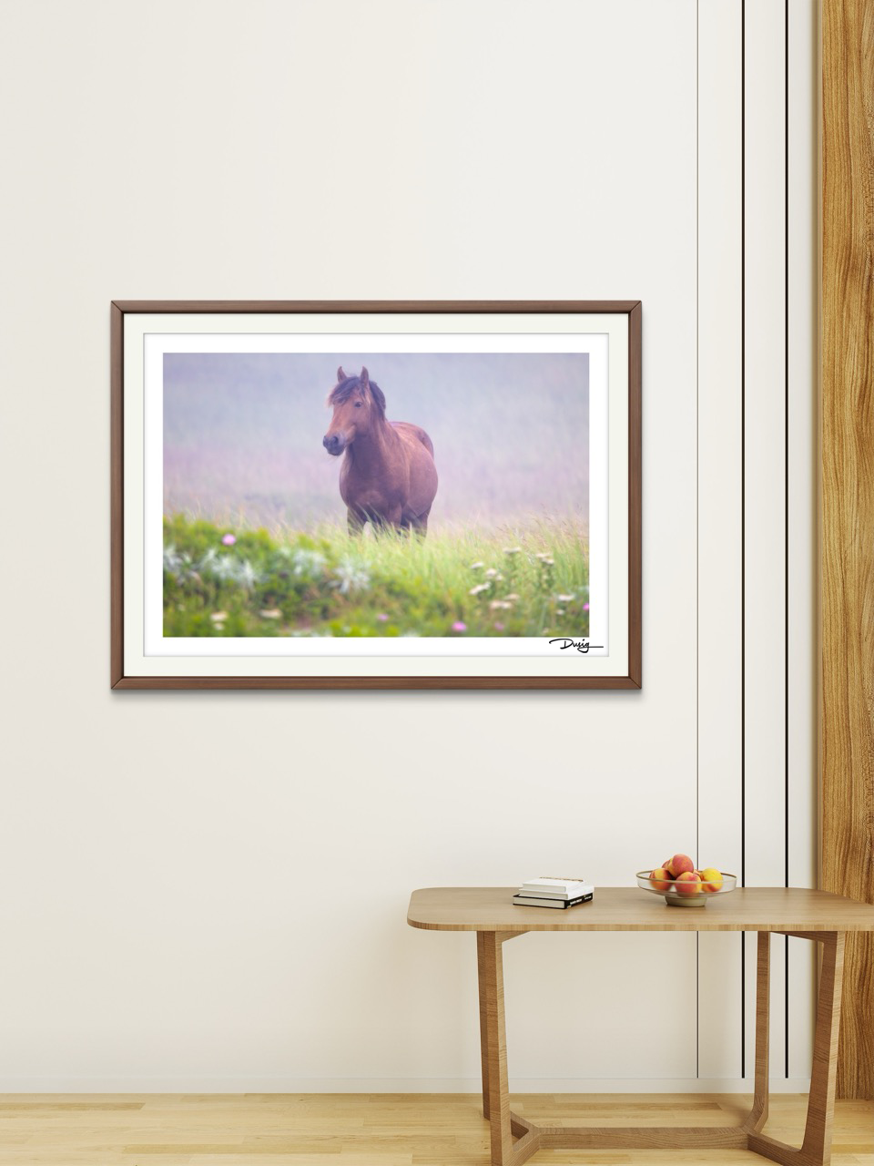 In this atmospheric photograph, a wild horse emerges from the soft embrace of the morning mist on Sable Island. Its poised stance, framed by the hazy backdrop of nature’s subtle colors, reflects both strength and serenity. The delicate fog lends an ethereal quality to the scene, highlighting the horse’s connection to its wild and untamed surroundings. This image captures a fleeting moment of solitude, where the wild beauty of Sable Island meets the quiet mystery of the landscape.