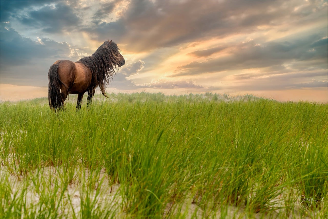 Amid the rolling dunes of Sable Island, a lone stallion stands tall, its windswept mane flowing like the grasses around it. As the sun dips beneath the horizon, casting golden hues across the sky, the horse gazes into the distance, embodying the raw, untamed spirit of the island. Its presence is commanding yet serene, a true guardian of the wild, silently watching over the ever-shifting sands. This is not just a horse, but a sentinel of the forgotten world, where nature reigns and time slows to a whisper.