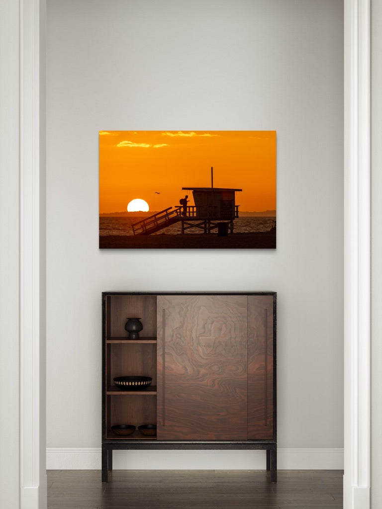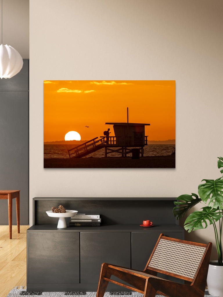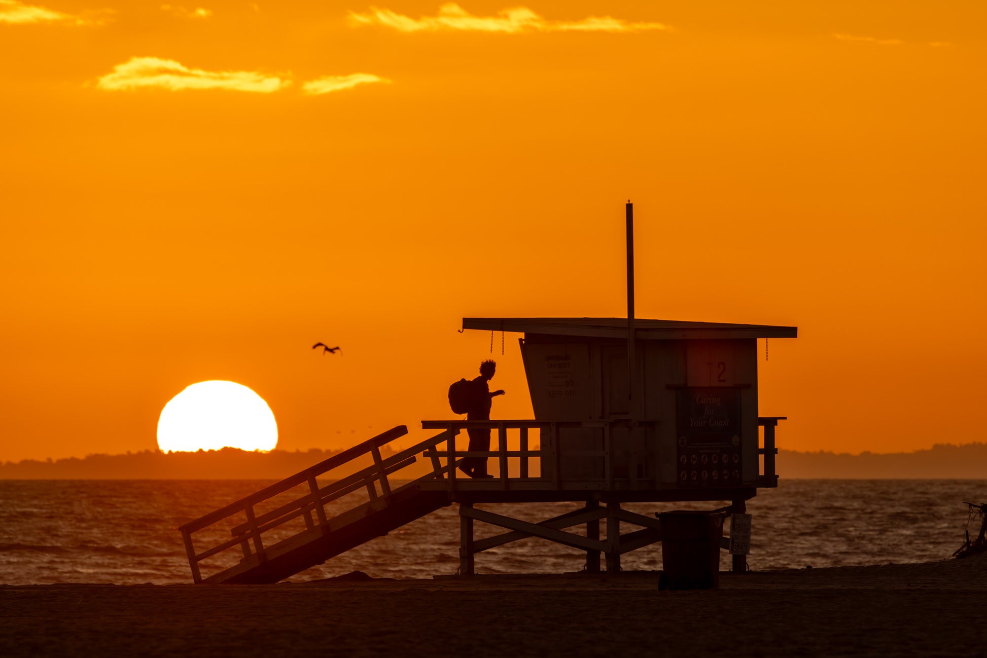 As the sun dips towards the horizon, the sky above Santa Monica beach is set ablaze with vibrant shades of orange and red, casting a silhouette of the iconic lifeguard tower. A single figure stands atop the wooden platform, perhaps reflecting on the day or simply basking in the tranquility of the evening. The sun, a fiery orb, takes center stage in this natural spectacle, while a bird glides effortlessly above the gentle waves, adding a sense of freedom to the scene. This moment, where day gives way to night, is a daily masterpiece, a reminder of nature's effortless beauty that graces the shores of Santa Monica.