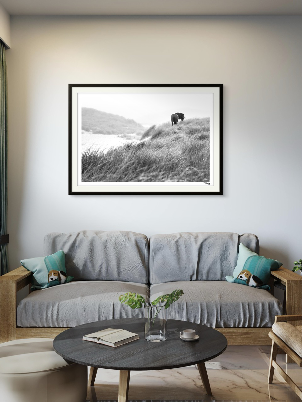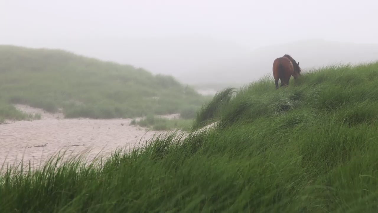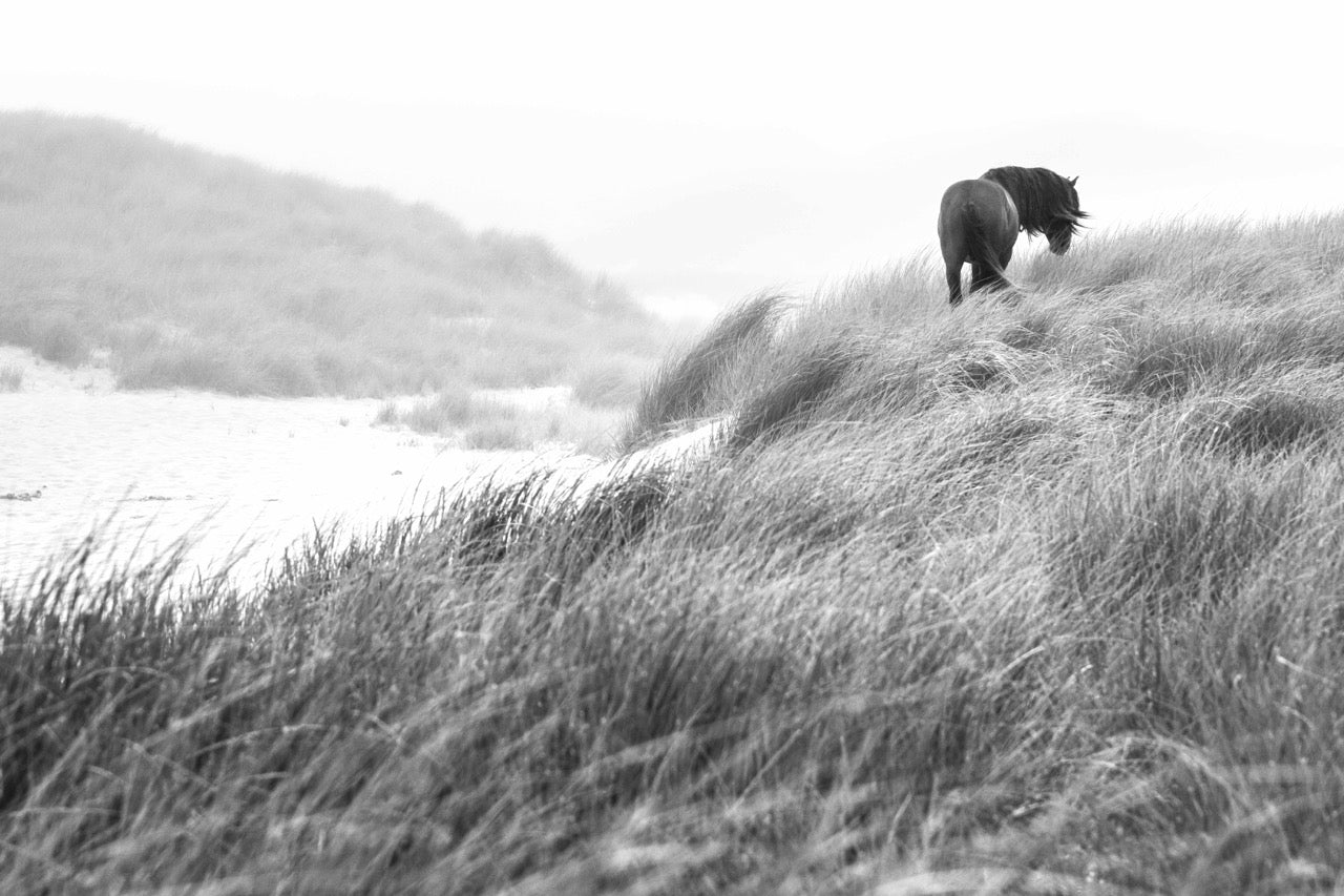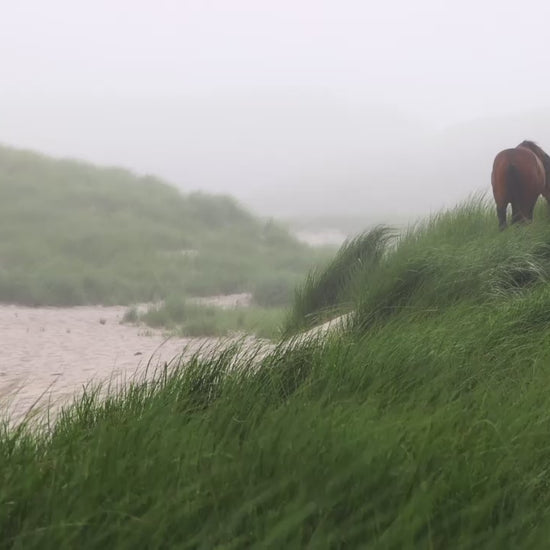 This black-and-white photograph captures the essence of solitude as a lone wild horse stands on a grassy dune, gazing into the distance. The soft, windswept grasses lead the eye toward the powerful silhouette of the horse, embodying the untamed beauty of Sable Island. The misty horizon and muted tones evoke a sense of quiet isolation, where the horse moves with purpose through the rugged landscape, unfettered by time or the presence of humans. This image is a powerful tribute to the resilience and freedom of Sable Island’s wild horses, living in harmony with the windswept beauty of their remote home.
