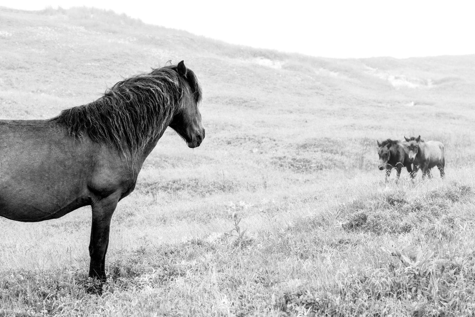 In the gentle grasslands of Sable Island, a mature horse stands watchful, gazing at two young foals in the distance. The monochromatic tones bring a sense of timelessness to the scene, highlighting the protective bond and quiet wisdom in the older horse's stance. The foals, just beginning their journey, appear small and vulnerable against the open landscape, symbolizing the continuity of life in the wild.