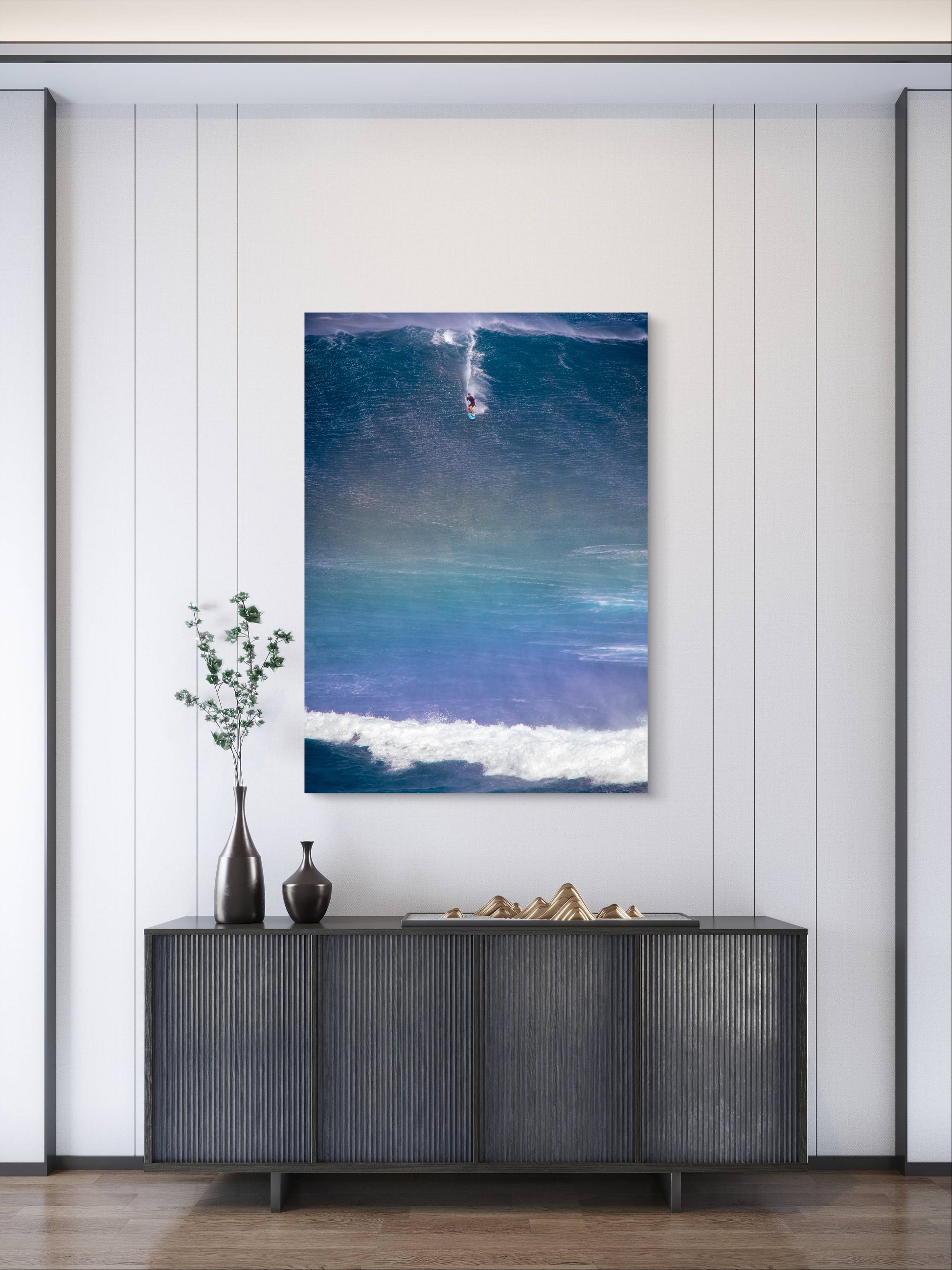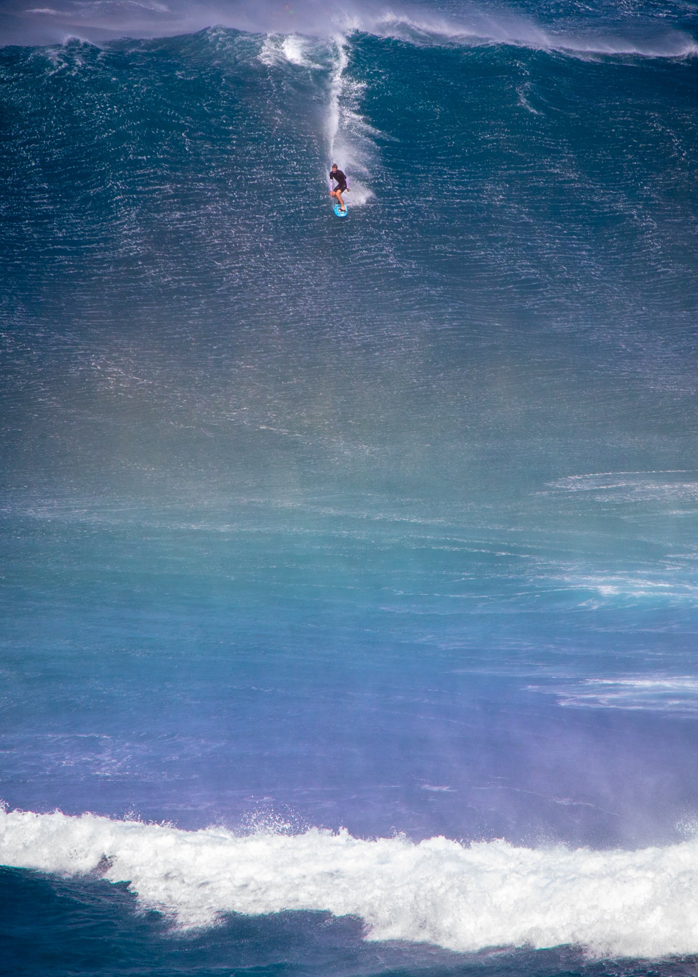 This image captures the exhilarating moment of a surfer confronting the immense power of the ocean. The surfer, a tiny figure in the vast expanse of blue, is poised on the crest of a massive wave, demonstrating both the grace and audacity of this extreme sport. The sunlight filtering through the wave creates an almost translucent effect, with shades of deep and light blue painting the waters. This photograph is a tribute to the adventurous spirit that defines the surfing culture in Hawaii, celebrating the bravery and skill required to ride these towering waves of the Pacific.
