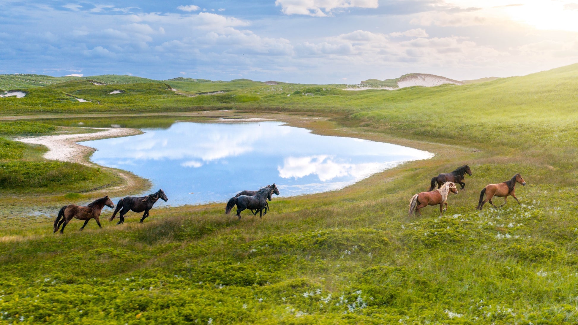 This photograph shows the herd mid-stride, their motion weaving across the grasses as if guided by the reflection of the sky. The energy of the animals contrasts with the stillness of the water, creating a harmonious balance.