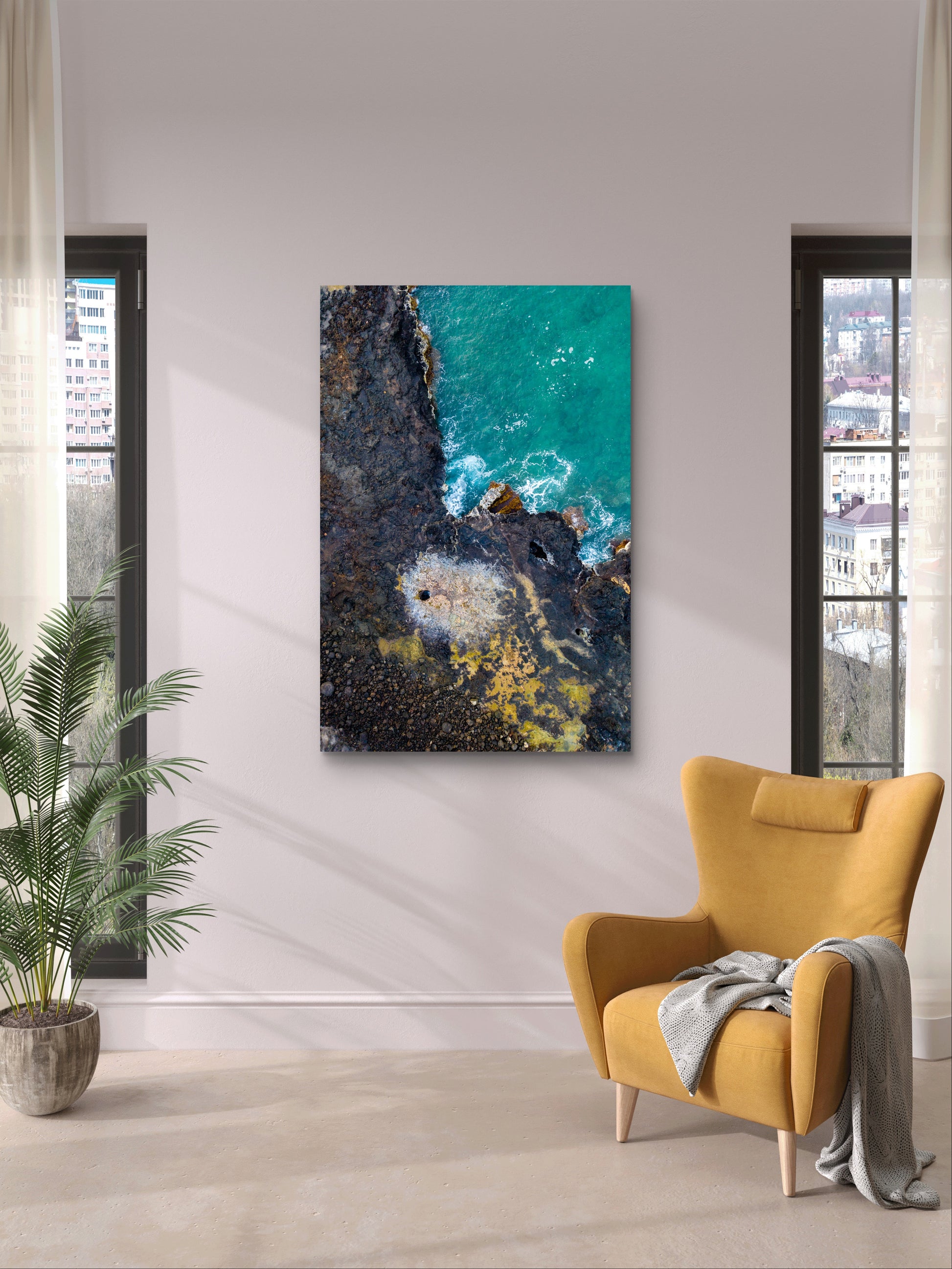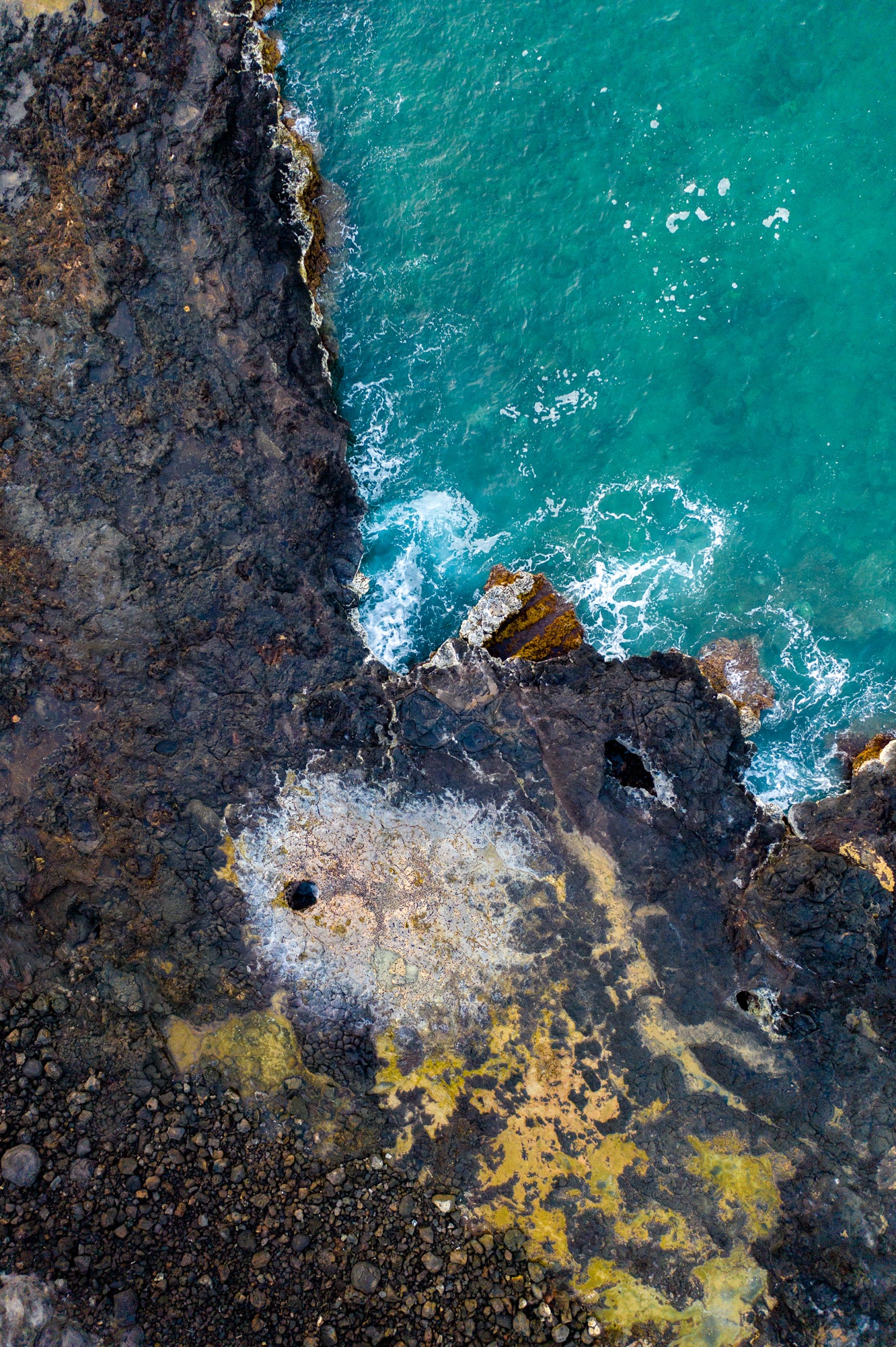 This dramatic aerial image captures the rugged coastline of Kauai’s famous Spouting Horn, where the vibrant turquoise waters of the Pacific clash with the dark volcanic rock formations. The natural patterns of the coastline, with patches of white and yellow hues blending with the rocky textures, create a visually stunning contrast that highlights the raw beauty of the island. Perfect for home or office spaces, this piece brings the wild spirit of Kauai’s coastline indoors, offering a striking focal point that celebrates nature’s unpredictable power and intricate beauty. Ideal for those who love coastal landscapes, it captures the unique allure of Hawaii’s natural wonders.