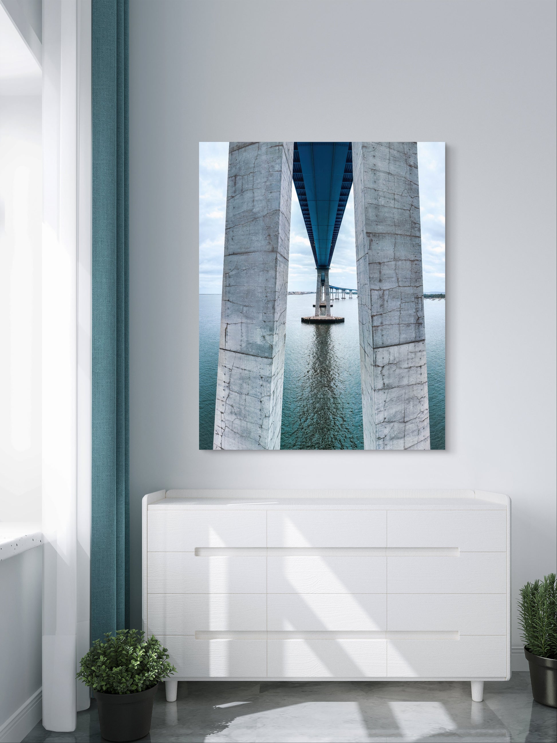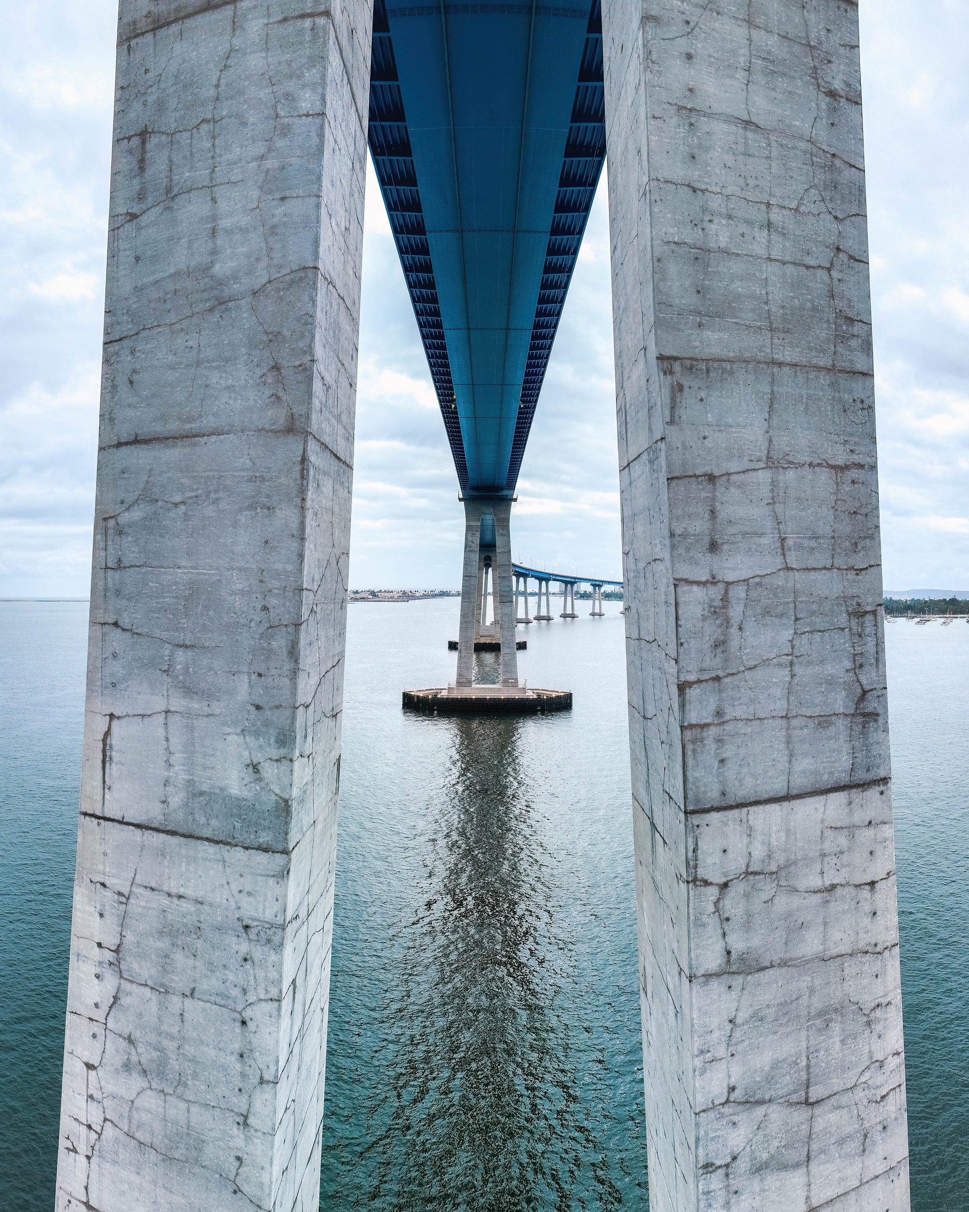 This striking photograph captures a unique and symmetrical view beneath the Coronado Bridge in San Diego. The towering concrete pillars frame the steel-blue underside of the bridge, creating a dramatic perspective that highlights the structure’s strength and elegance. The reflections in the water below add depth, while the distant shoreline provides a sense of scale and connection to the city.