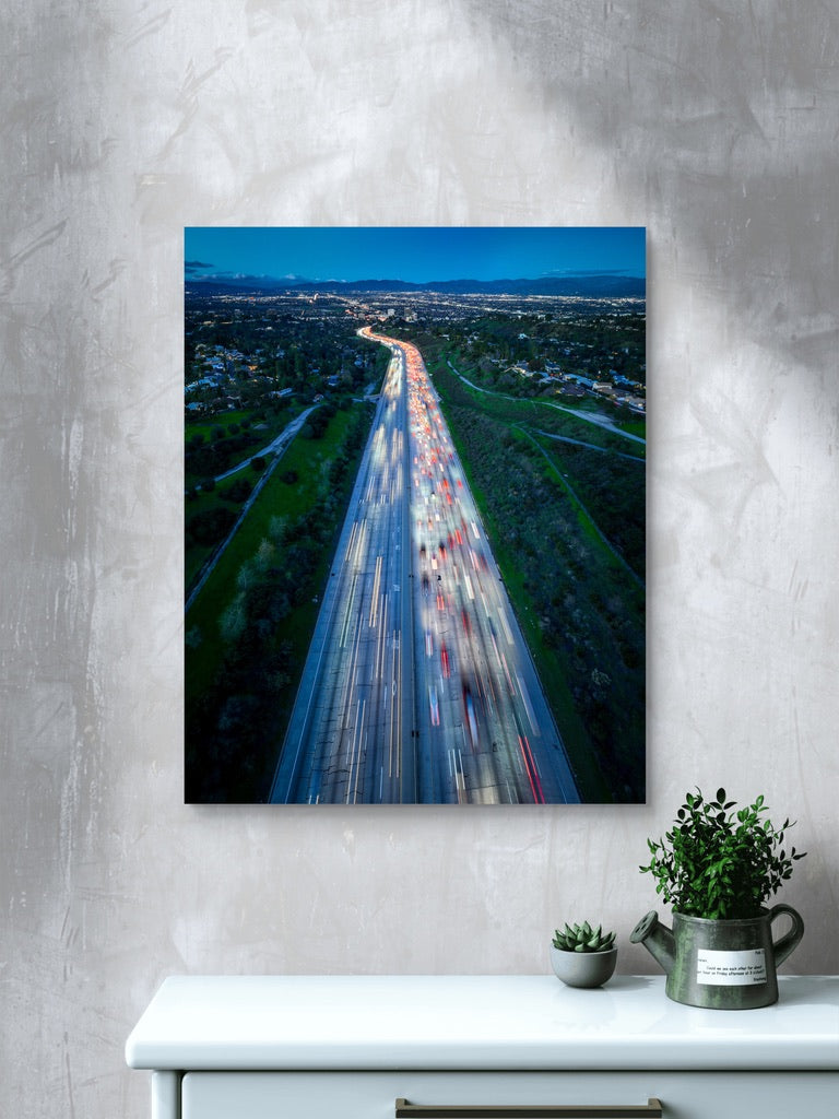 Perfect for an office or home, this artwork combines the serenity of natural landscapes with the vibrant energy of city life. "Evening Rush" offers a glimpse into the ceaseless flow of Los Angeles, making it an inspiring piece for anyone captivated by the city’s night scenes and architectural landscapes.