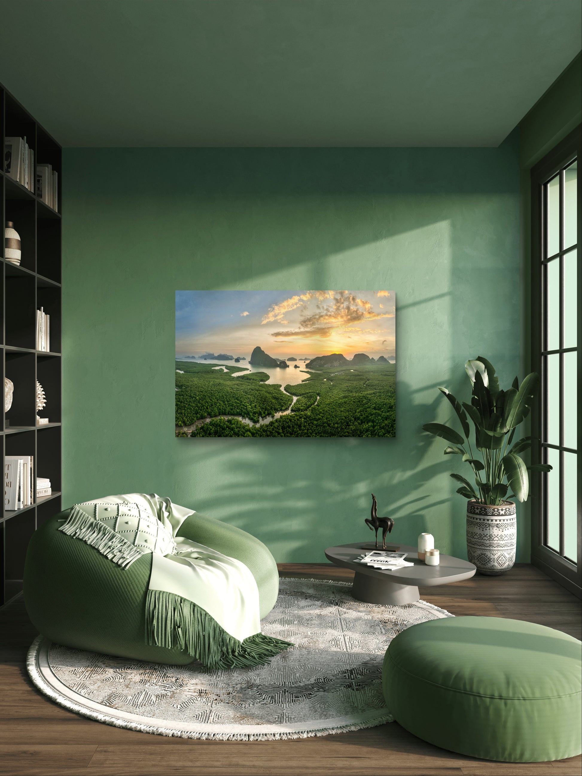 Perfect for a living room or office, this artwork brings a sense of calm and wanderlust into your space. The verdant greens and warm tones create an inviting atmosphere, transforming any setting into a peaceful retreat inspired by nature’s grandeur.