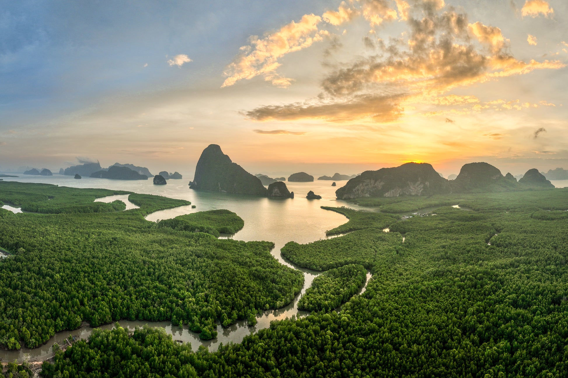 As the sun ascends over Phang Nga Bay, a golden glow kisses the lush green mangroves and still waters, casting the limestone karsts in soft, tranquil hues. This breathtaking panorama captures the delicate interplay of light and nature, showcasing the serene beauty of Thailand’s iconic bay at sunrise.