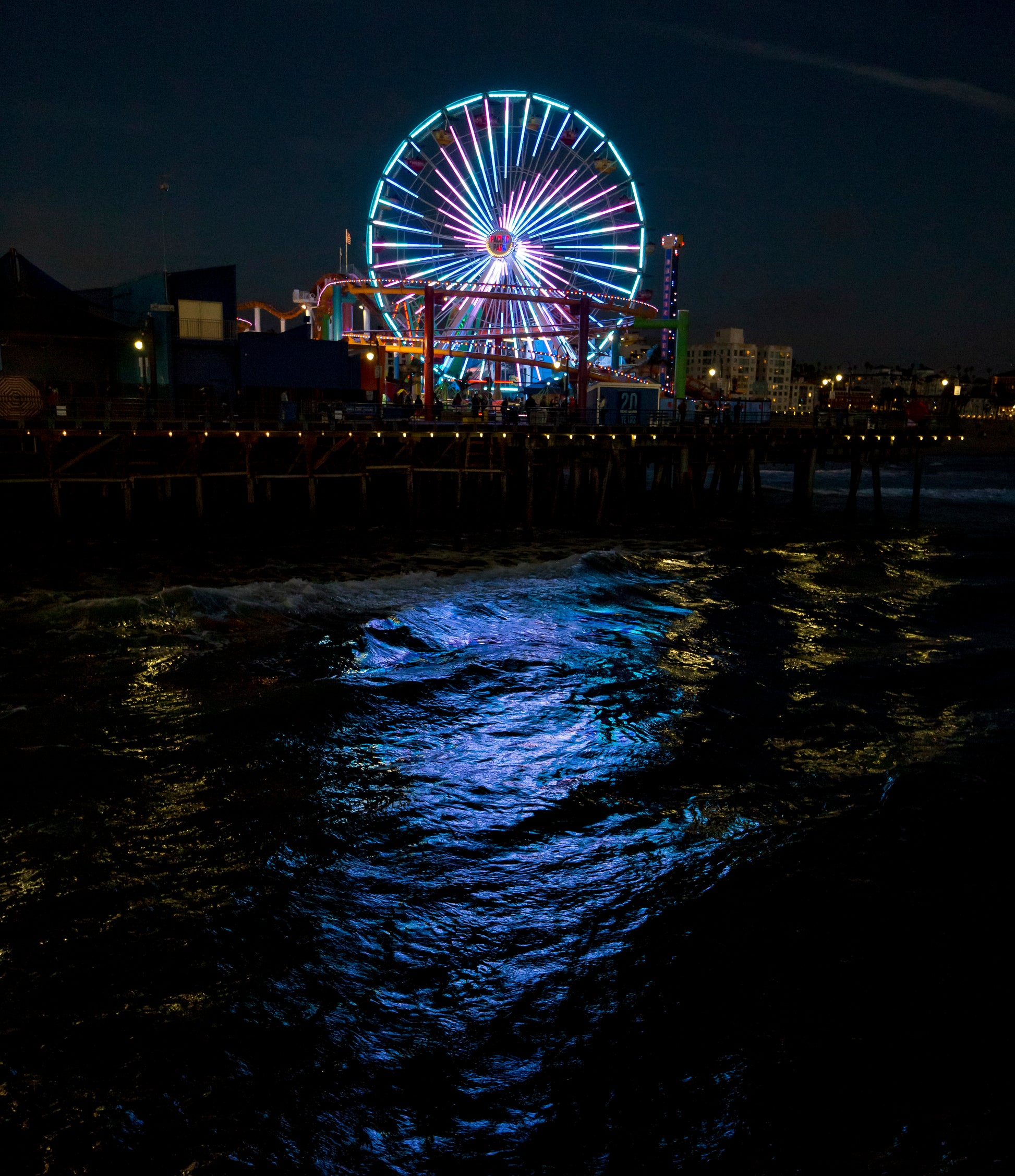 This vibrant nighttime photograph of the Santa Monica Pier showcases the iconic Ferris wheel illuminated in a kaleidoscope of neon colors, casting mesmerizing reflections on the rippling waters below. The dynamic movement of the waves and the glowing city lights create a captivating interplay of nature and human innovation.