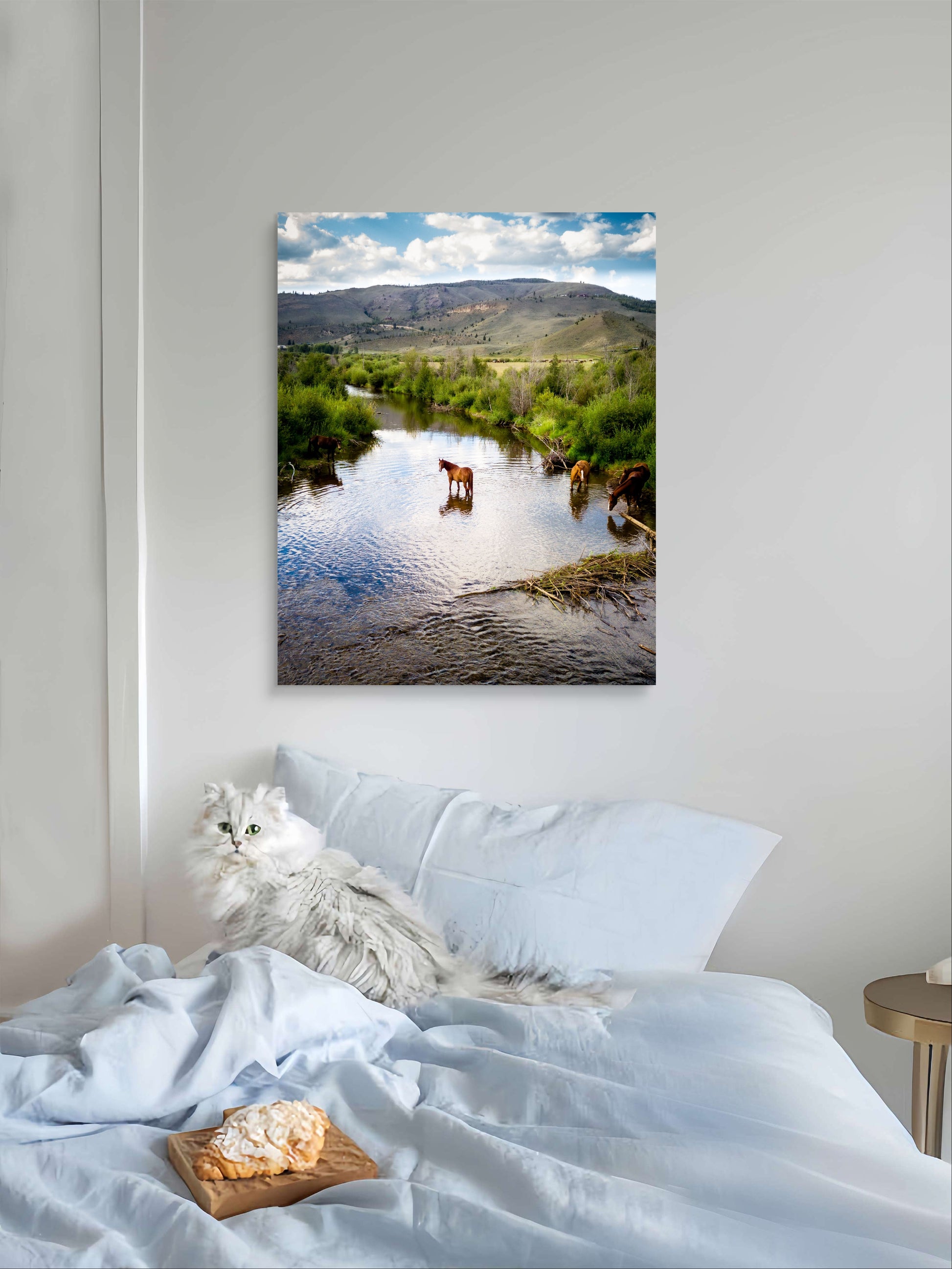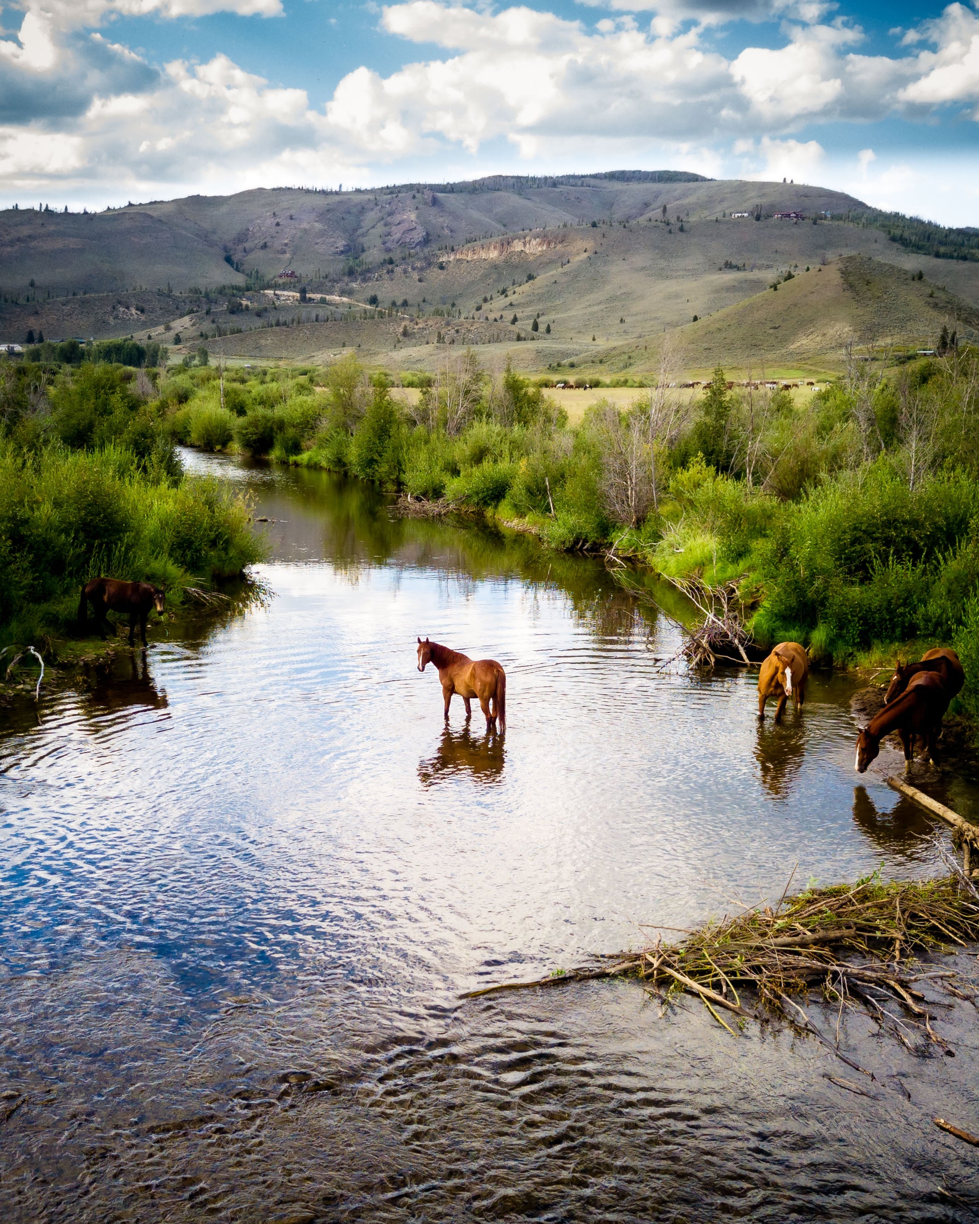 This picturesque scene captures the natural beauty of a private ranch in Colorado, where horses wade gently in a calm stream surrounded by vibrant greenery. The flowing water reflects the majestic creatures and the expansive sky above, while the rolling hills in the background add depth and tranquility to the composition. The peaceful coexistence of the horses and the untouched landscape creates a moment of serenity and connection to nature.