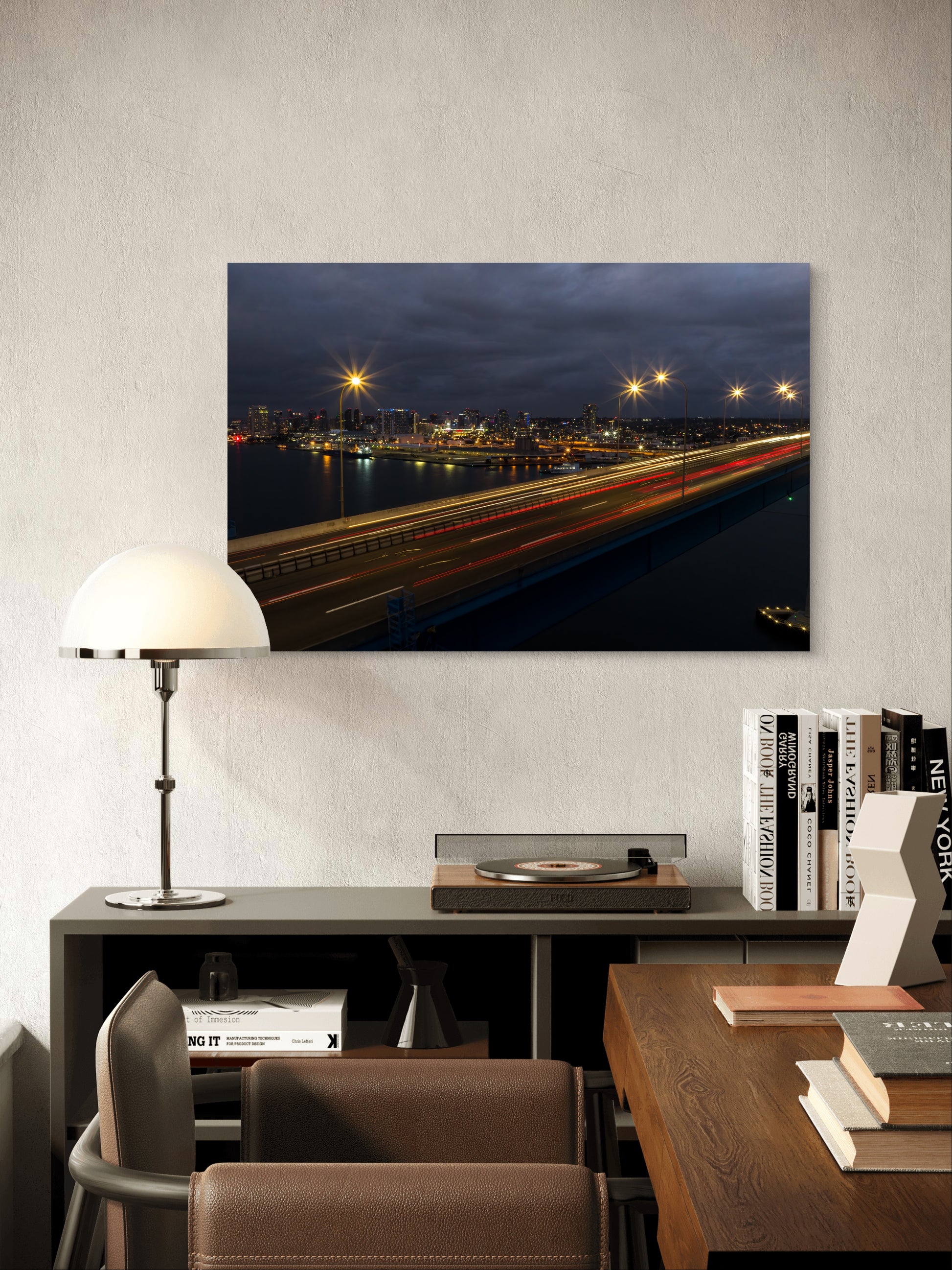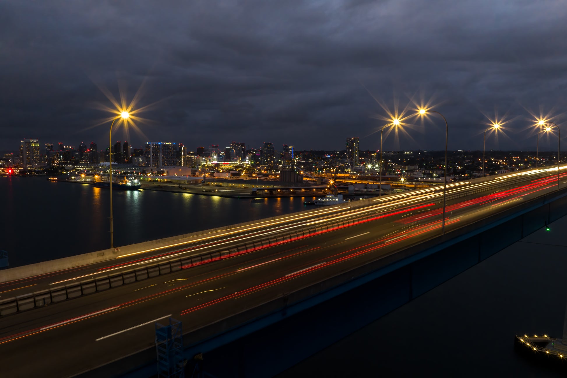 This stunning image captures the dynamic energy of San Diego's Coronado Bridge at night. The glowing city skyline provides a dazzling backdrop, while streaks of red and white light trails from passing vehicles create a sense of movement and rhythm. The soft starbursts of the streetlights add a magical touch to the scene, balancing the urban vibrancy with a tranquil night sky.