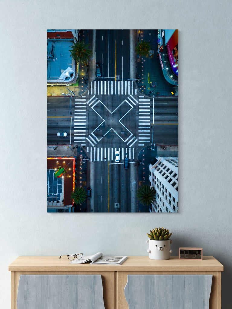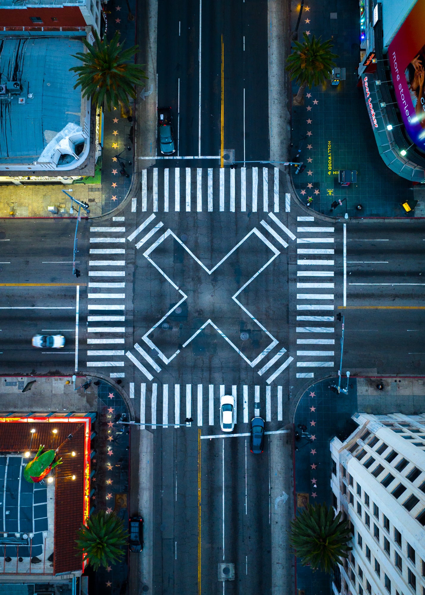 This aerial photograph captures the famous intersection of Hollywood Blvd and Highland Ave in Hollywood, Los Angeles. Viewed from above, the image reveals the intricate patterns of the crosswalks and the iconic 'X' shape that defines the area. The shot highlights the contrast between the bustling city streets and the stillness from an aerial perspective. Palm trees and sidewalks adorned with stars add to the scene's distinct Hollywood character, while the surrounding buildings offer a hint of the vibrant city life below.