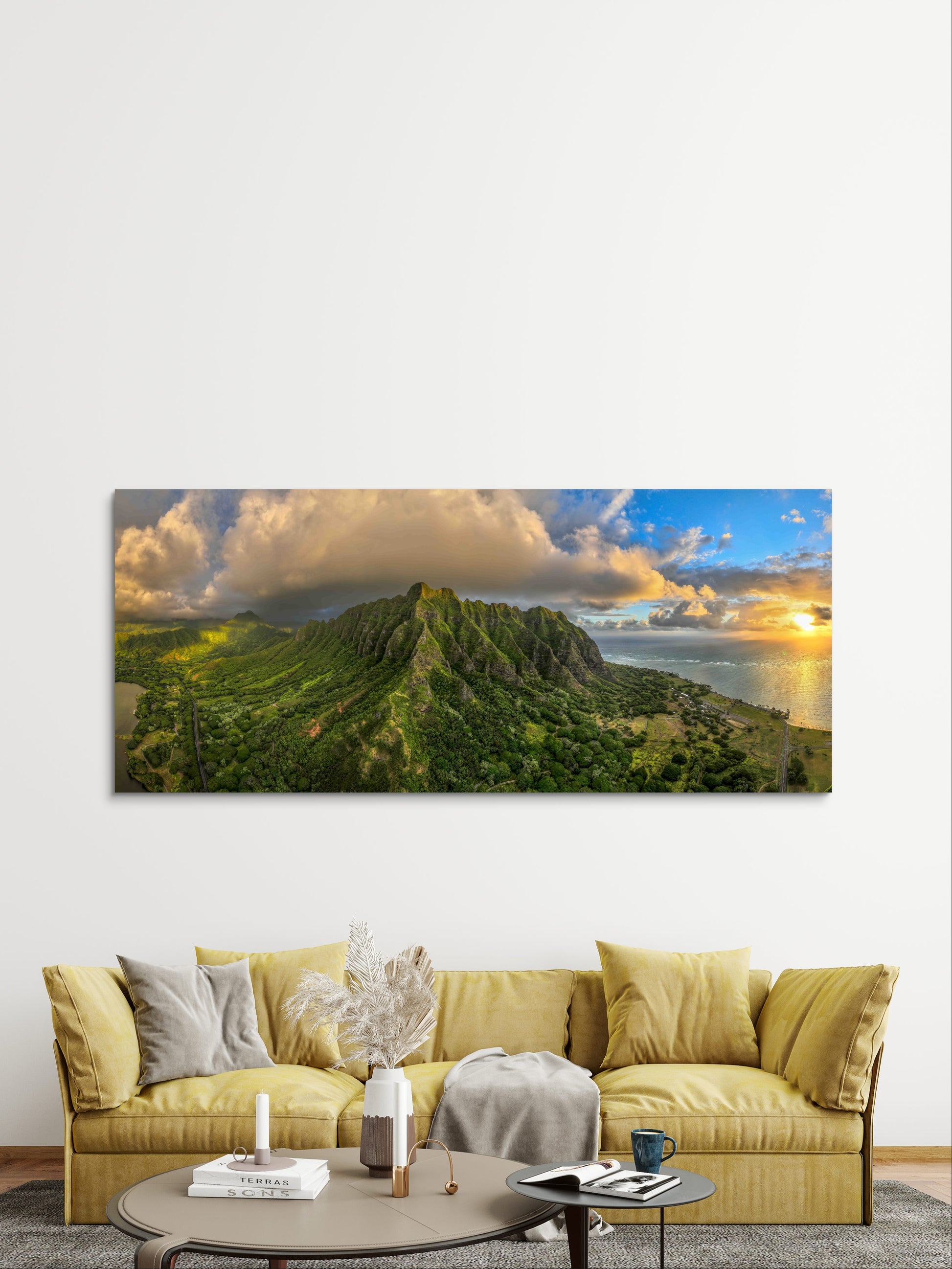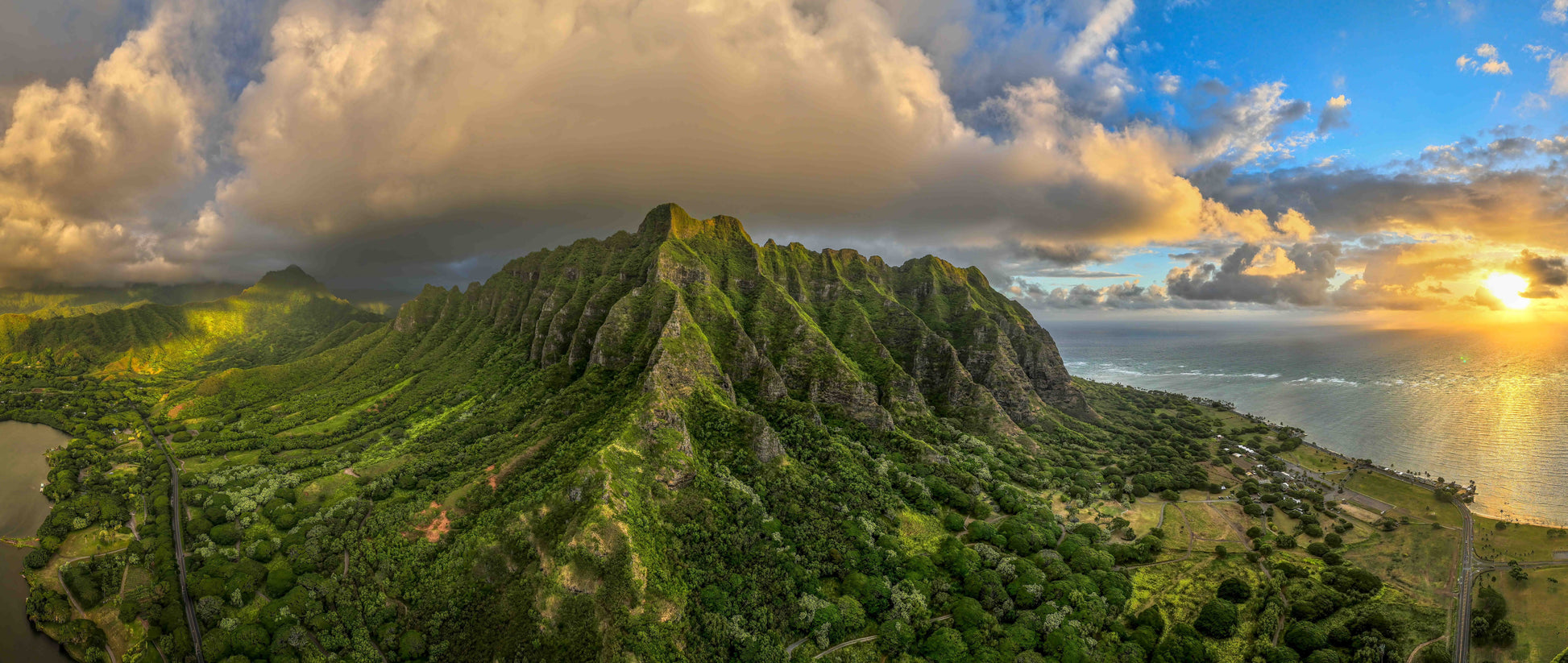This image presents the majestic Ko ªolau Range on Oahu as it basks in the golden light of sunrise. The panoramic view showcases the grandeur of the mountain's ridges, which rise like the back of a great dragon sleeping along the coast. The lush vegetation covering the landscape glows with a vibrant green, illuminated by the soft morning sunlight that filters through the clouds. The sky above is a dramatic display of nature's palette, with shades of orange, yellow, and blue melding together, hinting at the promise of a beautiful day ahead. Below, the calm waters reflect the tranquility of the scene, and the open fields and trees near the shoreline rest peacefully in the cool dawn. This breathtaking moment captures the essence of Oahu's natural beauty, a testament to the island's enduring allure and the awe-inspiring power of the earth's daily renewal.
