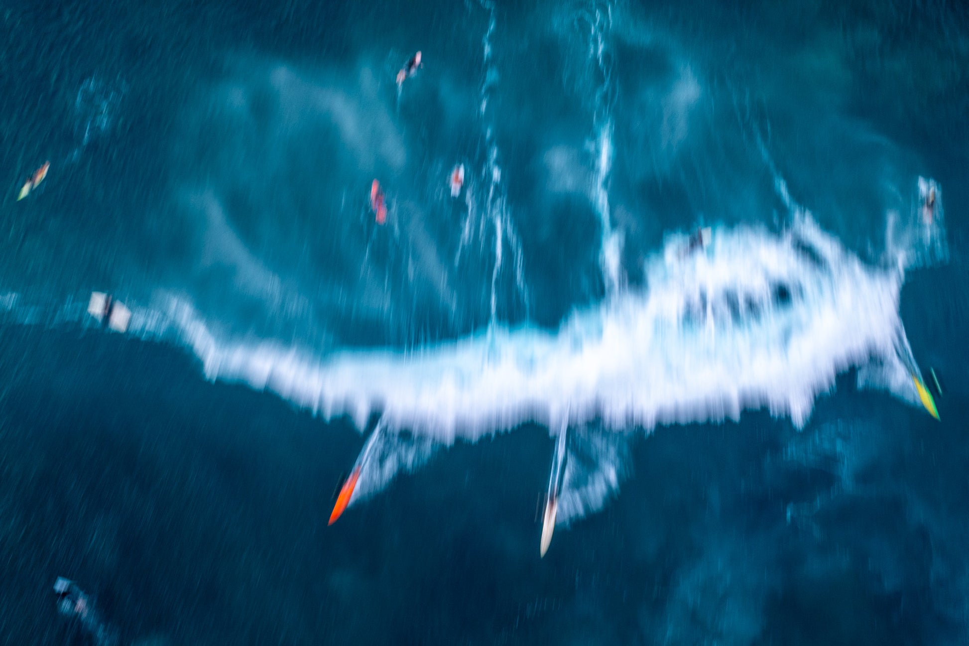 This image offers a unique, impressionistic portrayal of an active surf day at Pipeline on the North Shore of Oahu. The scene is a blur, capturing the frenetic movement of water and surfers alike. The white foam of the breaking wave creates a stark, sinuous line across the frame, dividing the deep blues and teals of the ocean. Surfers, identifiable by the flashes of color from their boards, appear as smudges and streaks, their forms distorted by motion and the churn of the sea. This photograph transcends the traditional action shot, instead offering a dreamlike view of the sport—where the details are less important than the feeling of movement, energy, and the chaotic dance between human and wave. It is a visual symphony of color, motion, and the raw power of nature, compelling in its abstraction and evocative of the surf's mesmerizing pull.