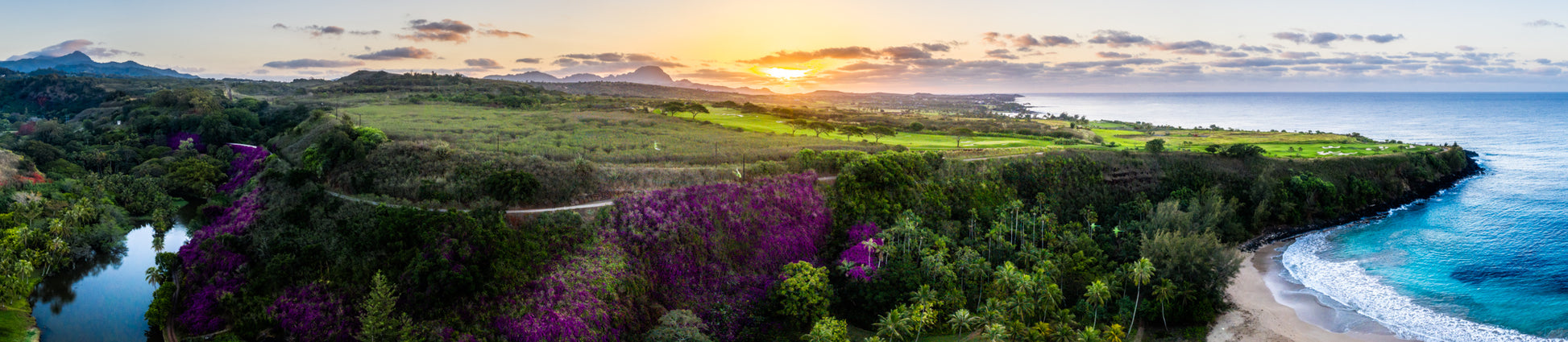 Sunrise Symphony is a panoramic homage to the tranquil beauty of dawn in Hawaii. As the day begins, the first light cascades over Kauai, illuminating verdant landscapes, lush valleys, and a pristine shoreline. Mist-laden hills cradle vibrant bursts of purple blossoms, while the gentle rhythm of the surf echoes along the coast, all combining to create a breathtaking spectacle that celebrates nature’s grandeur. This image is more than a visual experience; it’s an invitation to witness the serene awakening of the Garden Isle.