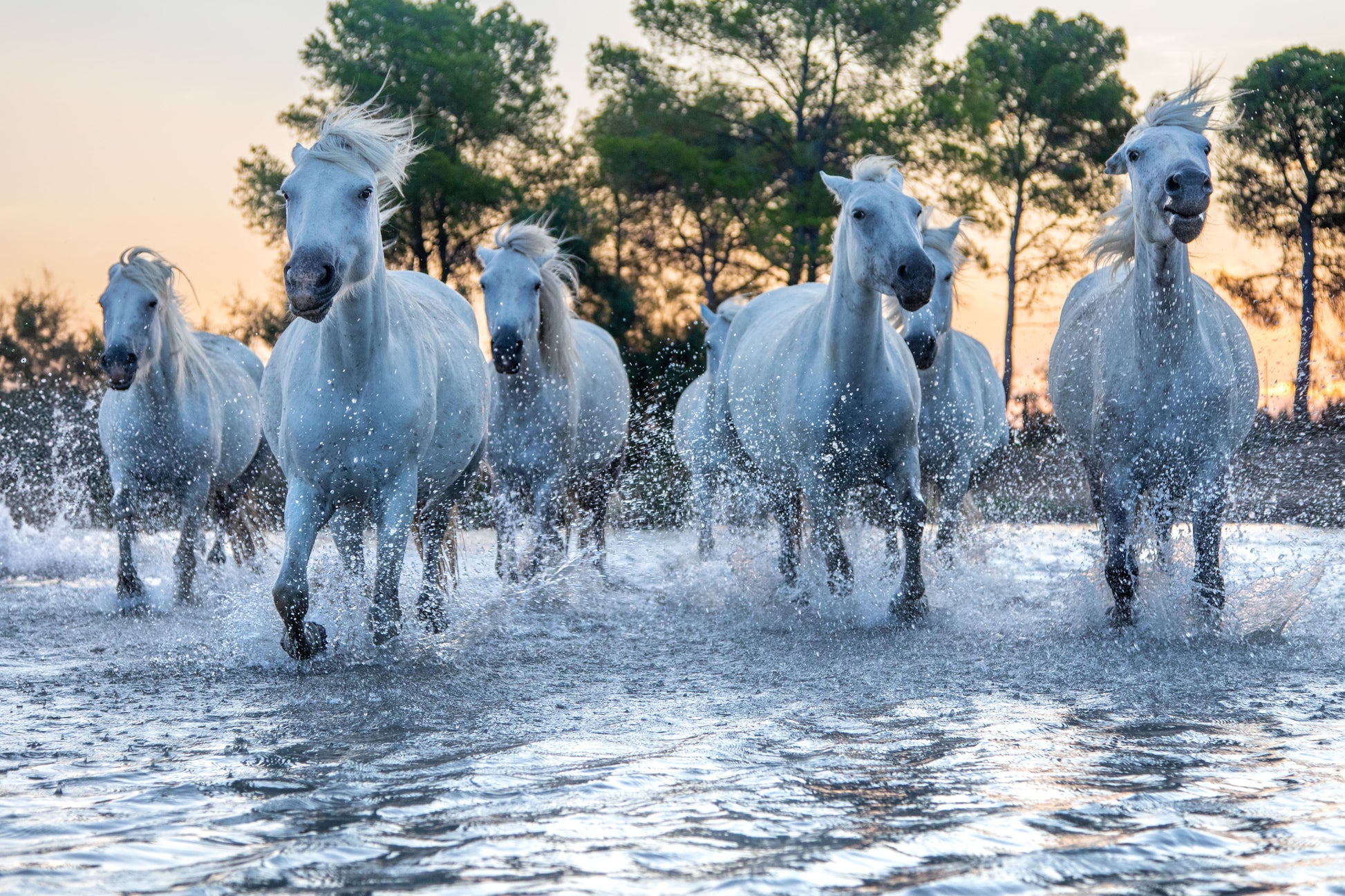 In the heart of the Camargue, a band of white horses thunders forward, their hooves kicking up sprays of water as the early light catches the droplets, transforming them into glistening jewels. This image captures a moment of unity, strength, and raw beauty as the horses gallop through the shallow waters with the trees silhouetted against the dawn sky behind them. The movement and natural elegance of these iconic Camargue horses bring the wild spirit of France’s southern wetlands vividly to life.