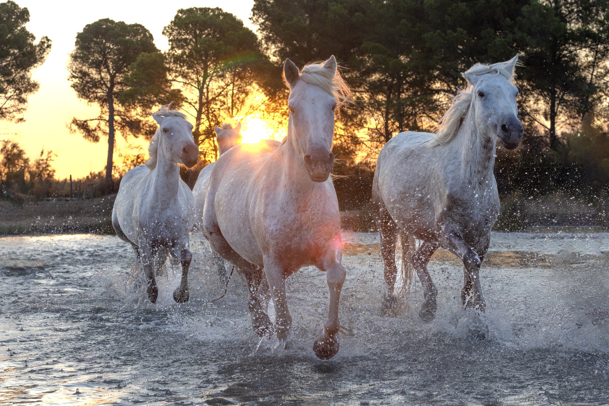 This dynamic image captures the essence of the iconic white horses of Camargue as they race through shallow water, bathed in the warm light of sunrise. Their powerful strides send droplets flying, reflecting the fiery hues of the morning sky. The sunlight glows through their manes, casting a natural halo that highlights their elegance and raw energy. The trees in the background frame the scene, adding depth to this beautiful moment of freedom and vitality.