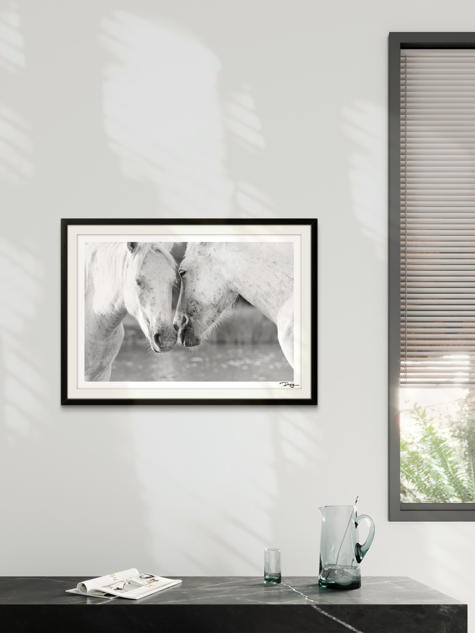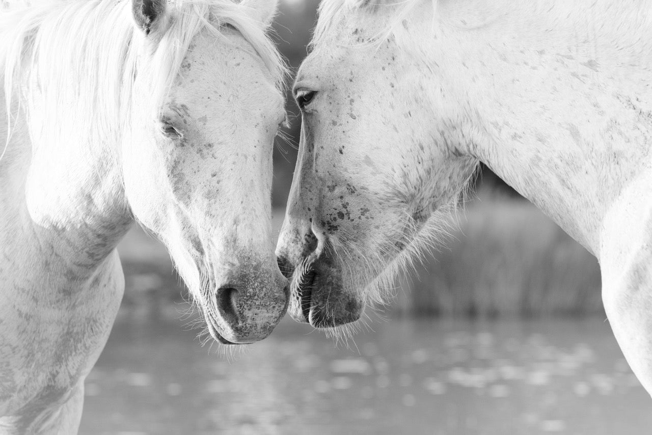 This intimate black-and-white photograph captures a tender moment between two Camargue horses, their heads gently touching in a display of affection. The closeness of the composition highlights the subtle details in their expressions, conveying an unspoken bond of trust and companionship. The soft lighting and monochromatic tones add a timeless quality to the scene, emphasizing the purity of the connection between these magnificent animals. Part of the "Camargue" collection, this piece evokes a sense of empathy and warmth, making it a perfect addition to spaces seeking to convey emotion, unity, and the beauty of genuine relationships.