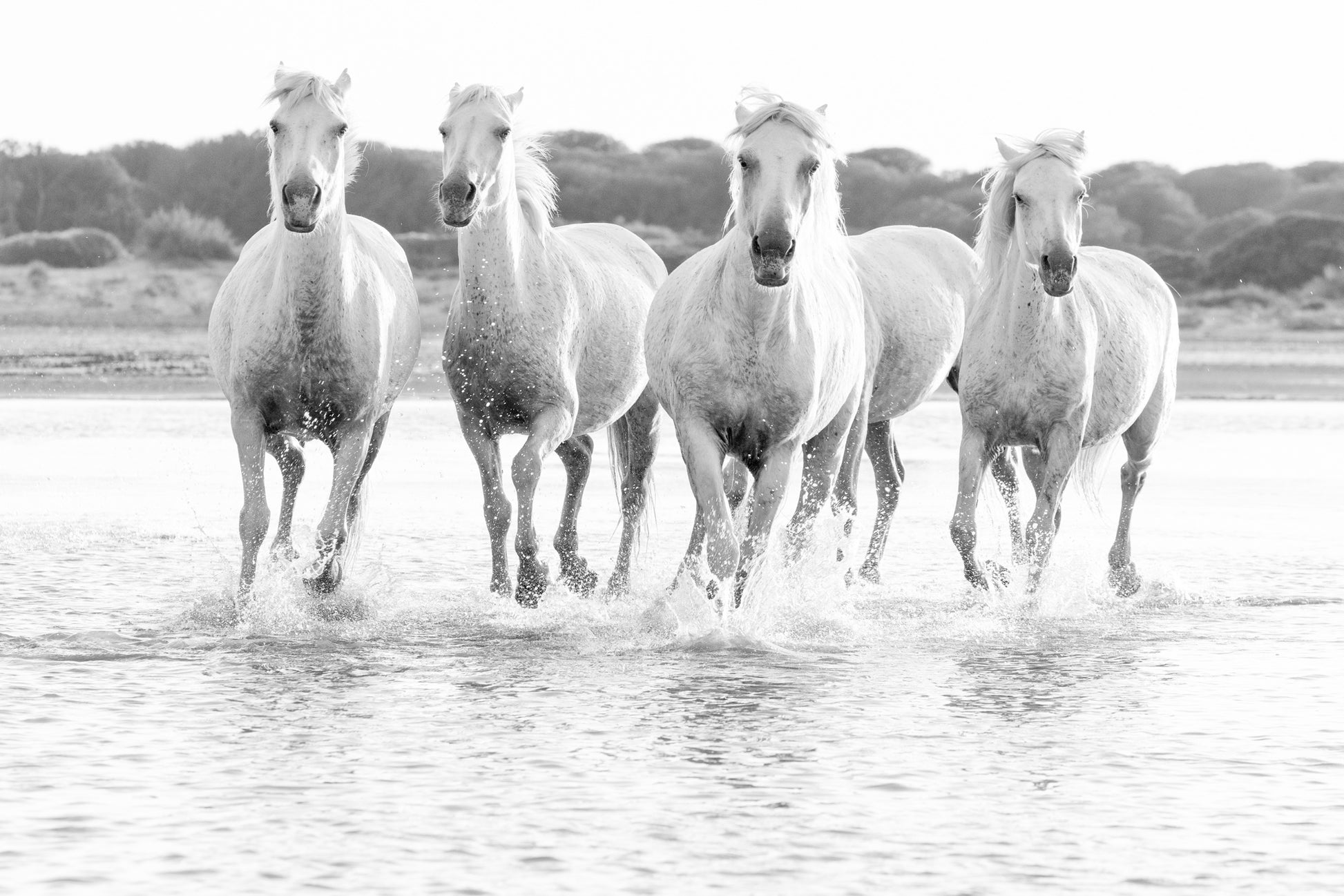 This stunning black-and-white image captures a quartet of Camargue white horses in stride, their muscular frames and flowing manes illuminated as they wade through shallow waters. Each horse’s expression exudes a mix of determination and calm confidence, while the water splashes beneath their hooves, adding an element of dynamic energy to this serene scene. Framed against a gentle, natural backdrop, the image speaks to the beauty of companionship and the enduring spirit of these wild horses.