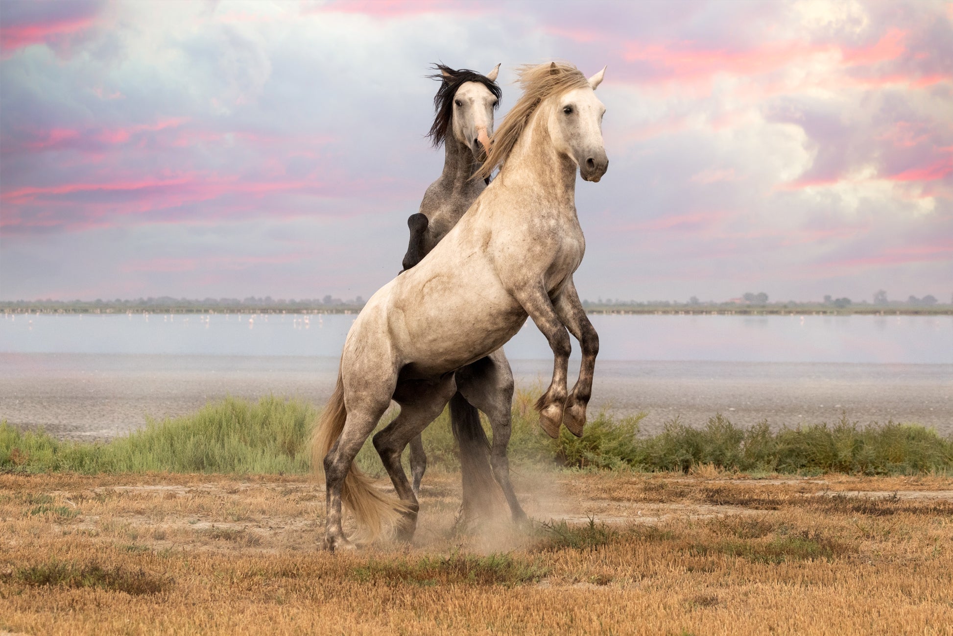 In a breathtaking display of power and poise, two Camargue stallions engage in a spirited confrontation, with one rising majestically onto its hind legs. Set against a stunning backdrop of tranquil water and a soft, pastel-hued sky, this image captures the raw energy and natural drama of the wild. The rearing horse, muscles taut and mane flowing, seems to command the scene, while its companion stands firm, embodying resilience and strength.