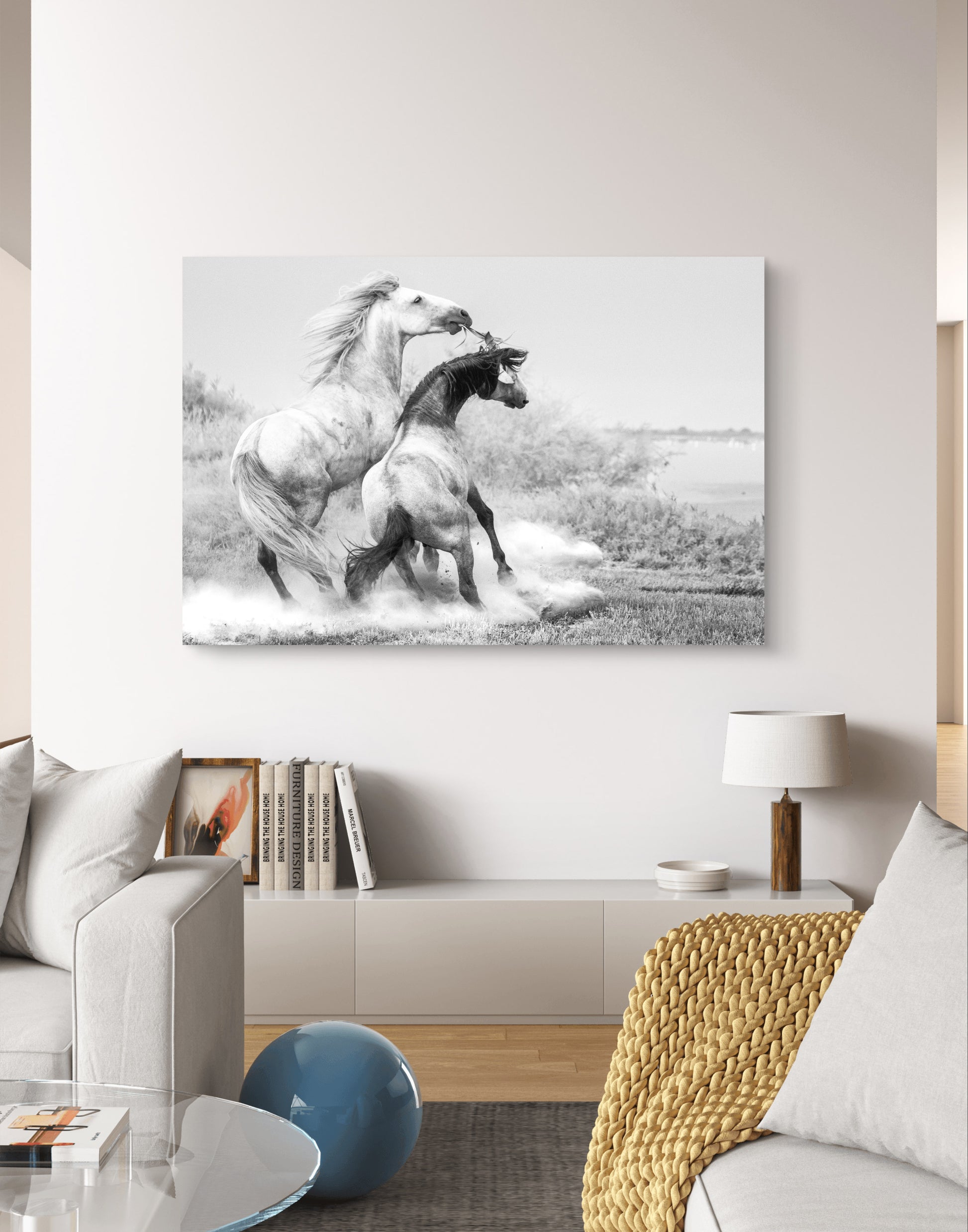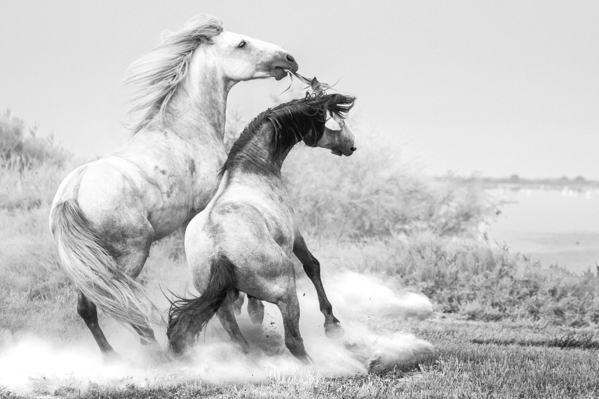 In this dramatic black-and-white composition, two powerful Camargue horses engage in a spirited clash, their movements a blend of raw strength and elegant agility. Captured amidst the wetlands of Southern France, the rising dust amplifies their energy, while the soft background evokes the serene beauty of their natural habitat. The striking contrast between their flowing manes and muscular forms enhances the image's intensity, embodying the untamed spirit of these majestic creatures.