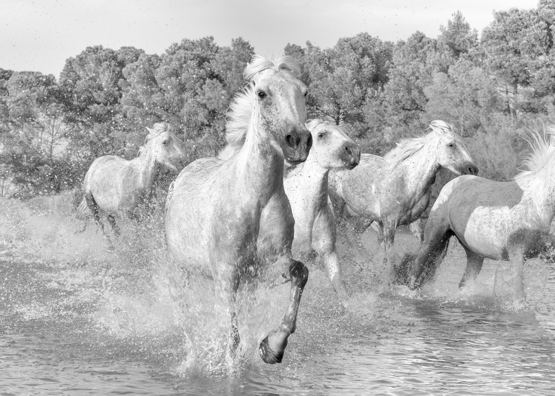 This striking black-and-white photograph captures the power and grace of the Camargue horses as they thunder through the water, each droplet suspended in mid-air, adding an energetic texture to the scene. The leading horse, full of spirit and strength, charges forward, embodying the wild freedom that defines these magnificent creatures. The herd follows closely behind, unified in motion, their expressions focused and determined.