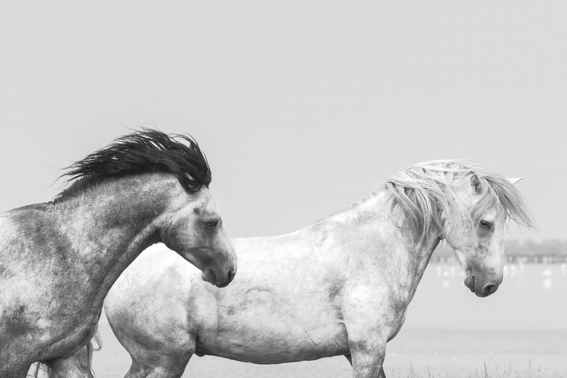 This serene black-and-white image captures the quiet grace of two Camargue horses, their flowing manes caught in the wind as they move in unison. The scene is infused with a sense of calm, highlighting the harmony and unspoken connection between these noble creatures. The soft, blurred background adds depth and places the focus entirely on the horses, emphasizing their timeless beauty.