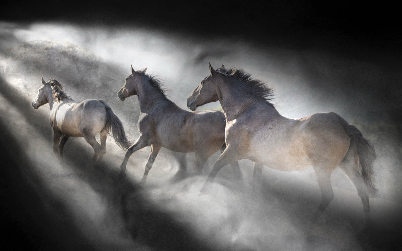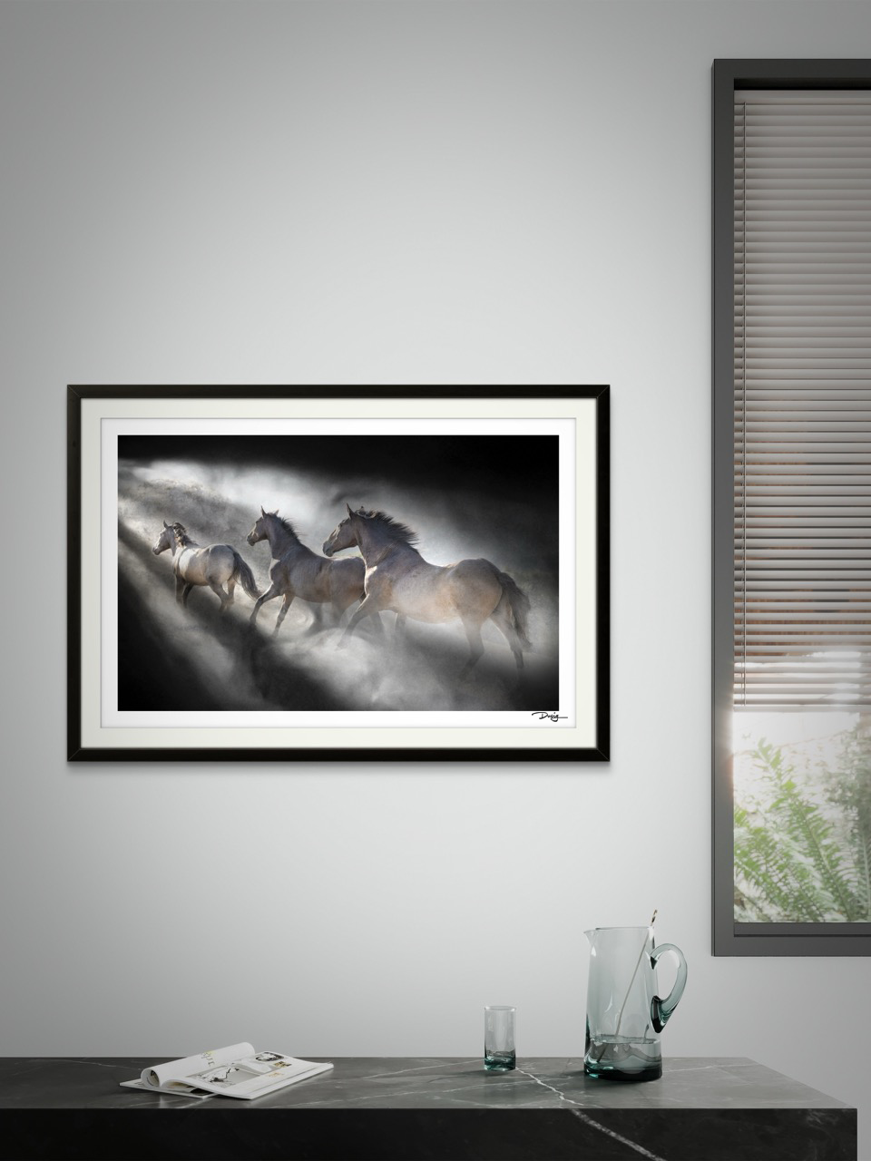 "Chasing Light and Shadow" presents a dynamic scene of three wild mustangs galloping through a misty, sun-dappled landscape. The interplay of light and shadow creates a dramatic effect, highlighting the powerful and fluid motion of the horses as they move in unison. Their muscular forms and flowing manes are accentuated by the beams of light piercing through the mist, emphasizing their grace and strength. This photograph captures the essence of wild freedom and the beauty of nature in motion, evoking a sense of wonder and admiration for these majestic creatures.