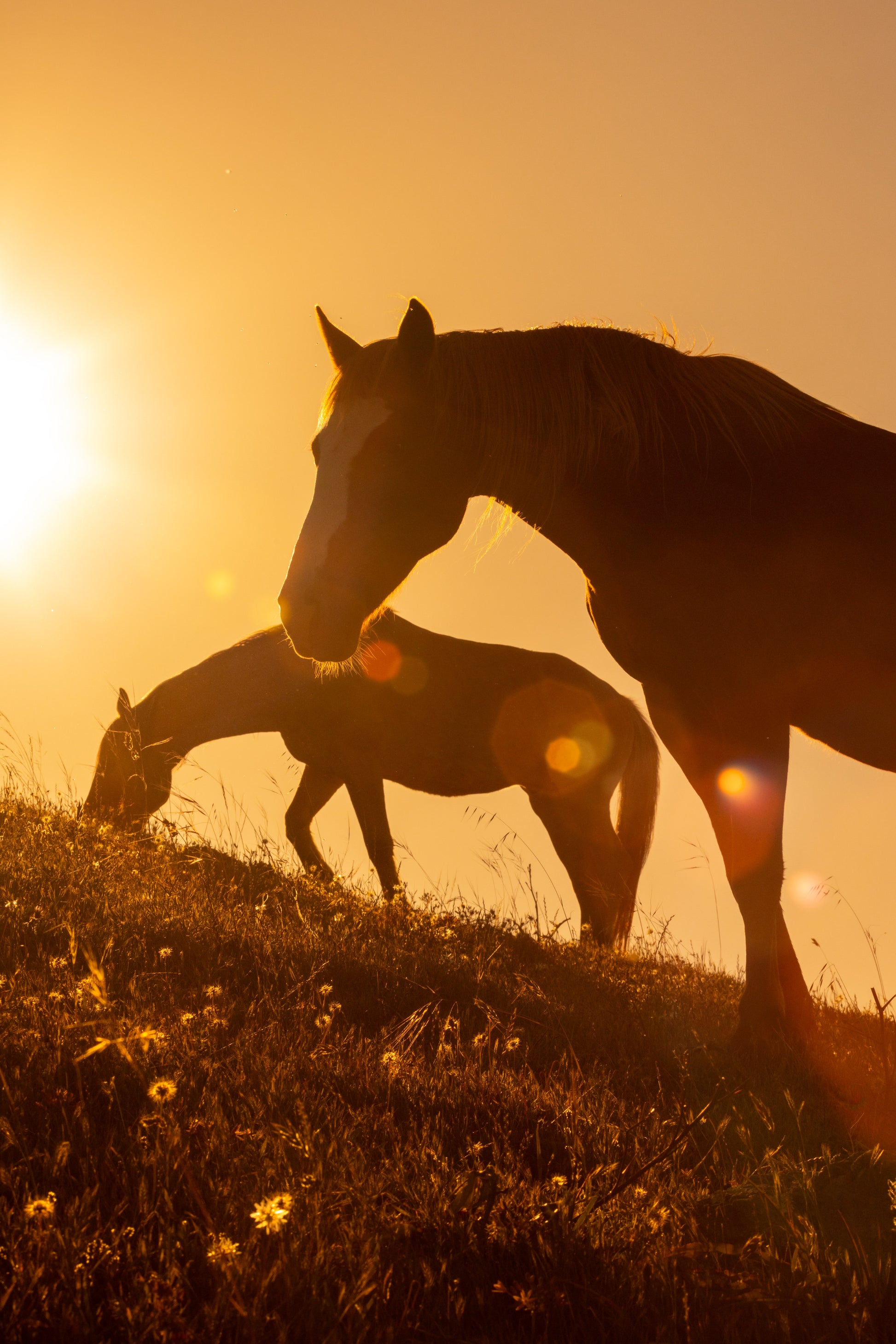 Bathed in the warm glow of the setting sun, this image captures a tranquil moment as two horses graze peacefully on a hillside, their forms silhouetted against the golden light. The sun's rays cast a dreamy lens flare, adding depth and enhancing the sense of quiet beauty in the scene. The gentle slope, dotted with wildflowers, creates a natural stage for the horses, who appear almost ethereal in the soft light of dusk.