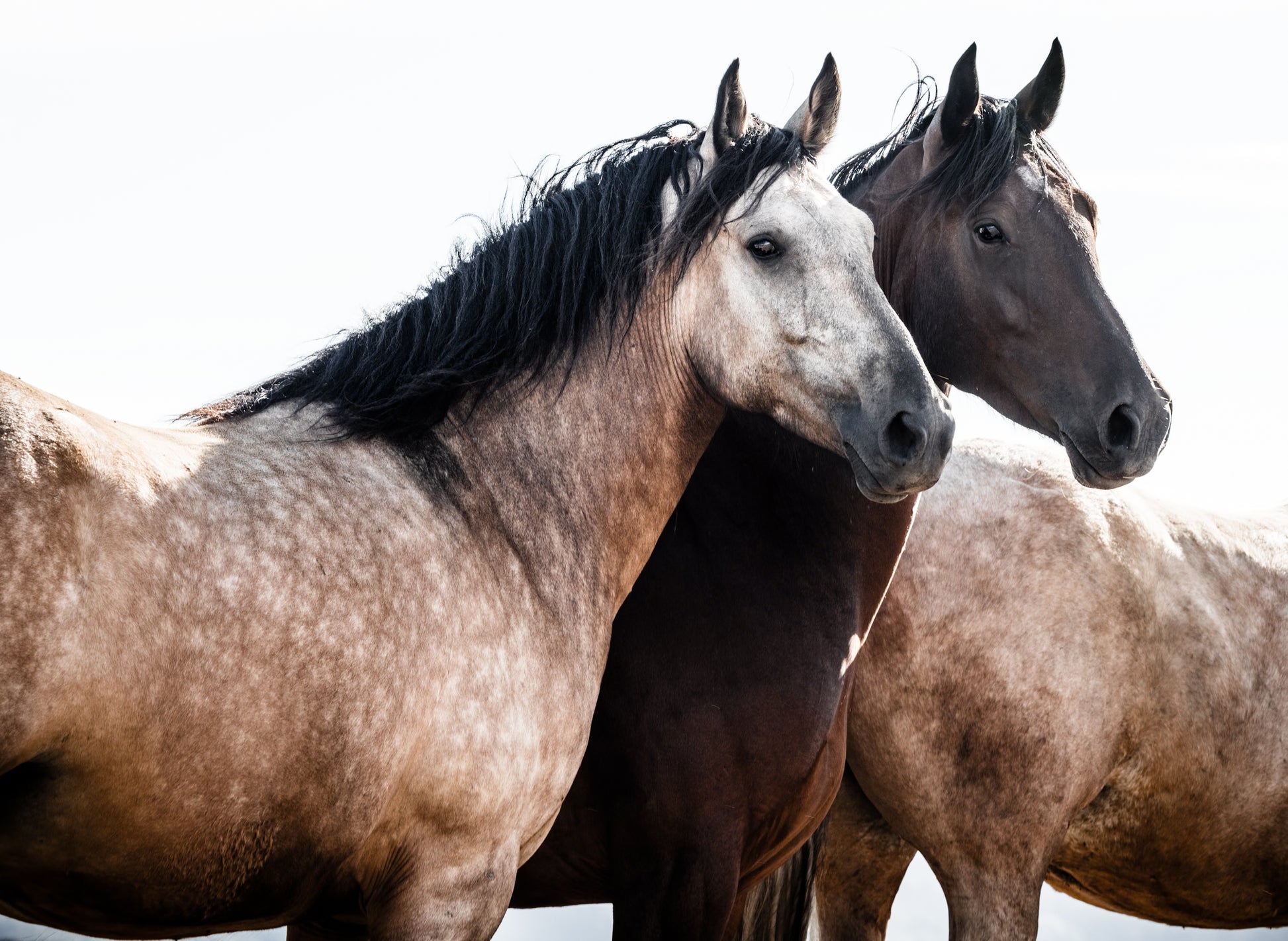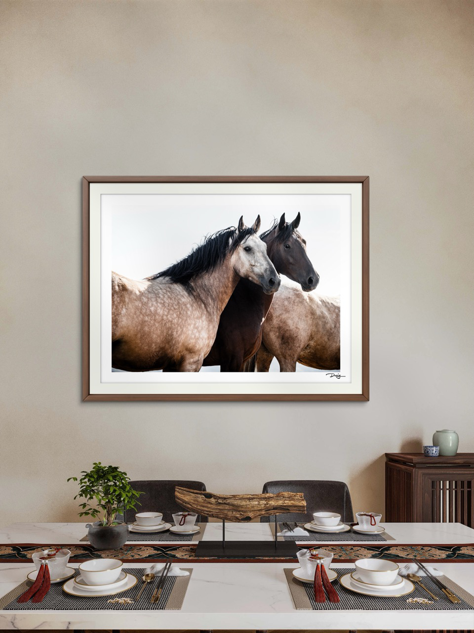 This photograph captures a moment of unity between two wild mustangs, their gazes fixed on a distant horizon as they stand side by side. Their strong yet graceful profiles exude a sense of calm determination, while their powerful frames showcase the raw beauty of these majestic creatures. The intricate textures of their coats, highlighted by soft natural light, bring out the individual character of each horse, yet together they represent the unbreakable bond of companionship.