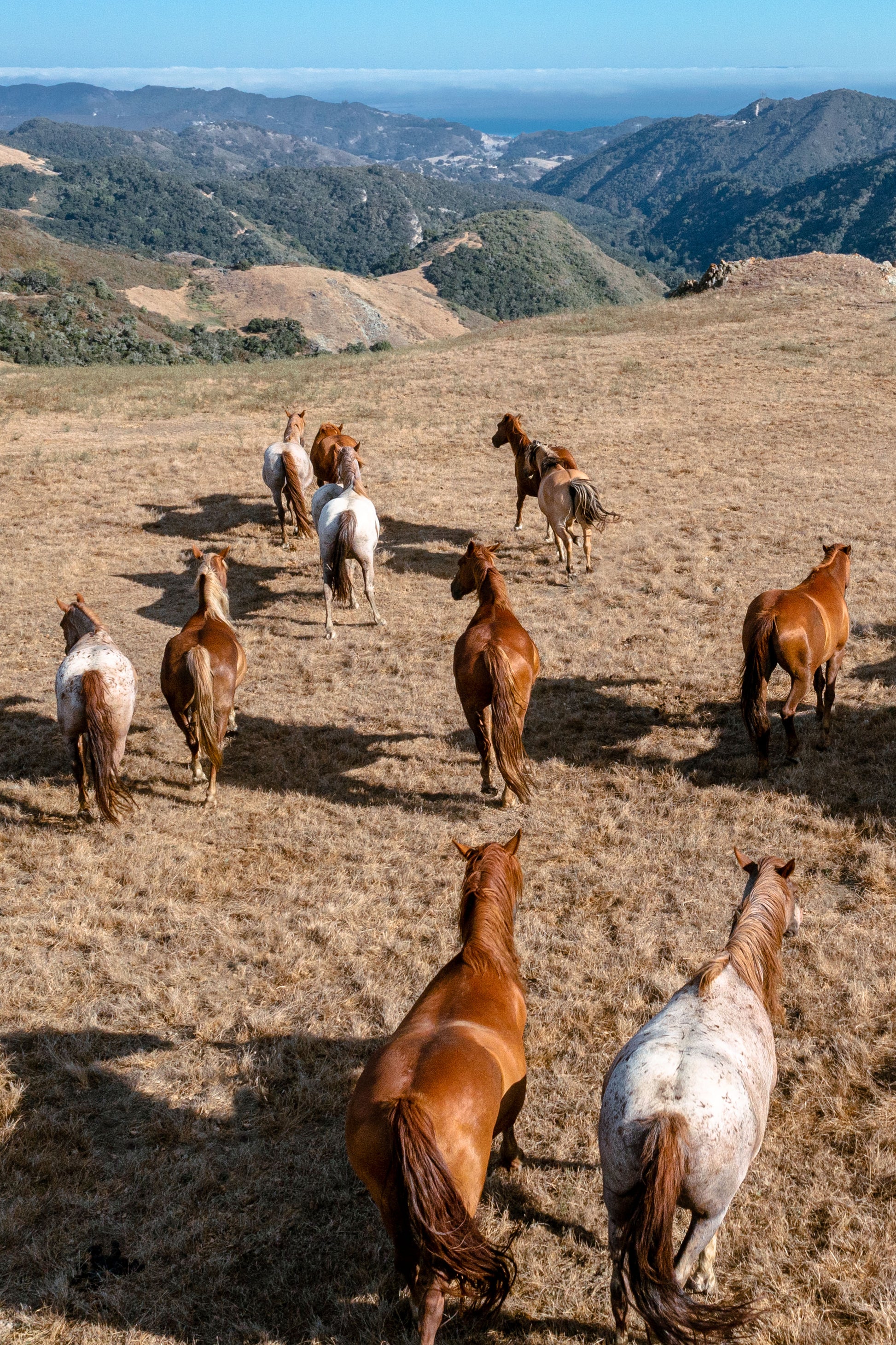 In this breathtaking scene, a group of mustangs charges forward across the open terrain, their powerful forms silhouetted against the sweeping landscape of rolling hills and distant mountains. The photograph captures the raw energy and unity of these majestic creatures as they move in harmony, tails flying and muscles rippling under the sunlight. The perspective offers a rare glimpse of freedom and camaraderie, as the horses seem to vanish into the vastness of the wilderness ahead, embodying the spirit of the wild.