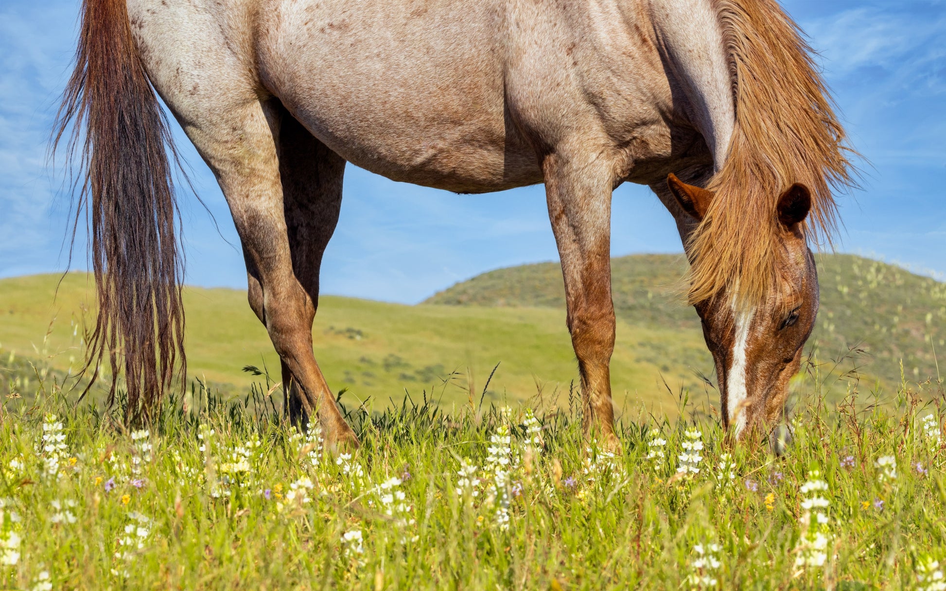 In this peaceful scene, a horse is captured grazing amidst a meadow of wildflowers, its earthy coat blending beautifully with the vibrant greens and soft whites of the field. The bright sunlight highlights the rich textures of the horse’s mane and the delicate flowers surrounding it, creating an image that feels both tranquil and full of life. The rolling hills and clear blue sky in the background enhance the sense of open space and freedom, embodying the sanctuary of Return to Freedom.