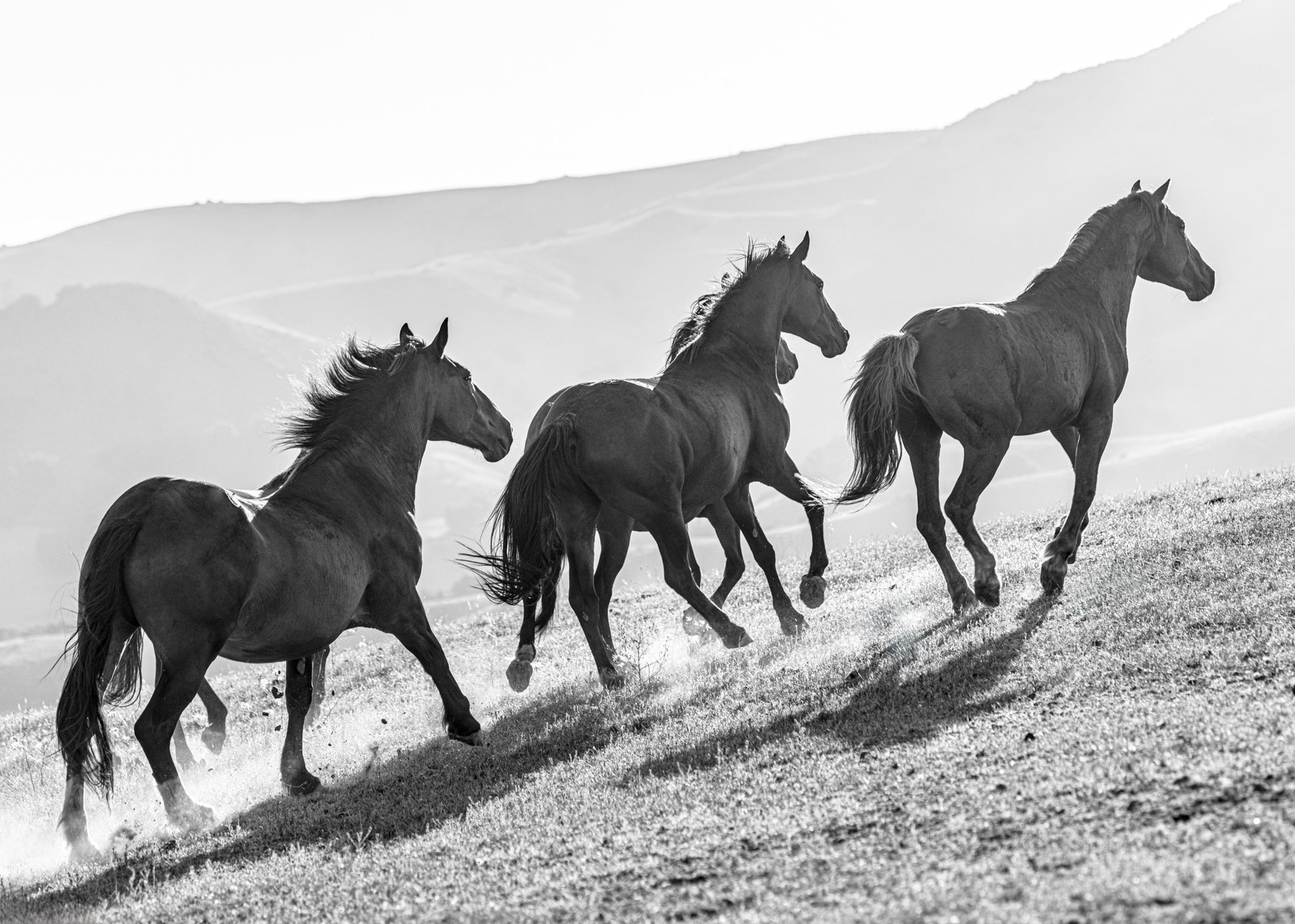 Captured in a breathtaking black-and-white portrait, these wild mustangs are a testament to strength, freedom, and the raw beauty of the American West. The photograph reveals their powerful forms in mid-stride, muscles rippling as they surge forward across the rugged landscape. Each mustang seems to carry the weight of history, embodying resilience and the unyielding spirit of wild freedom.