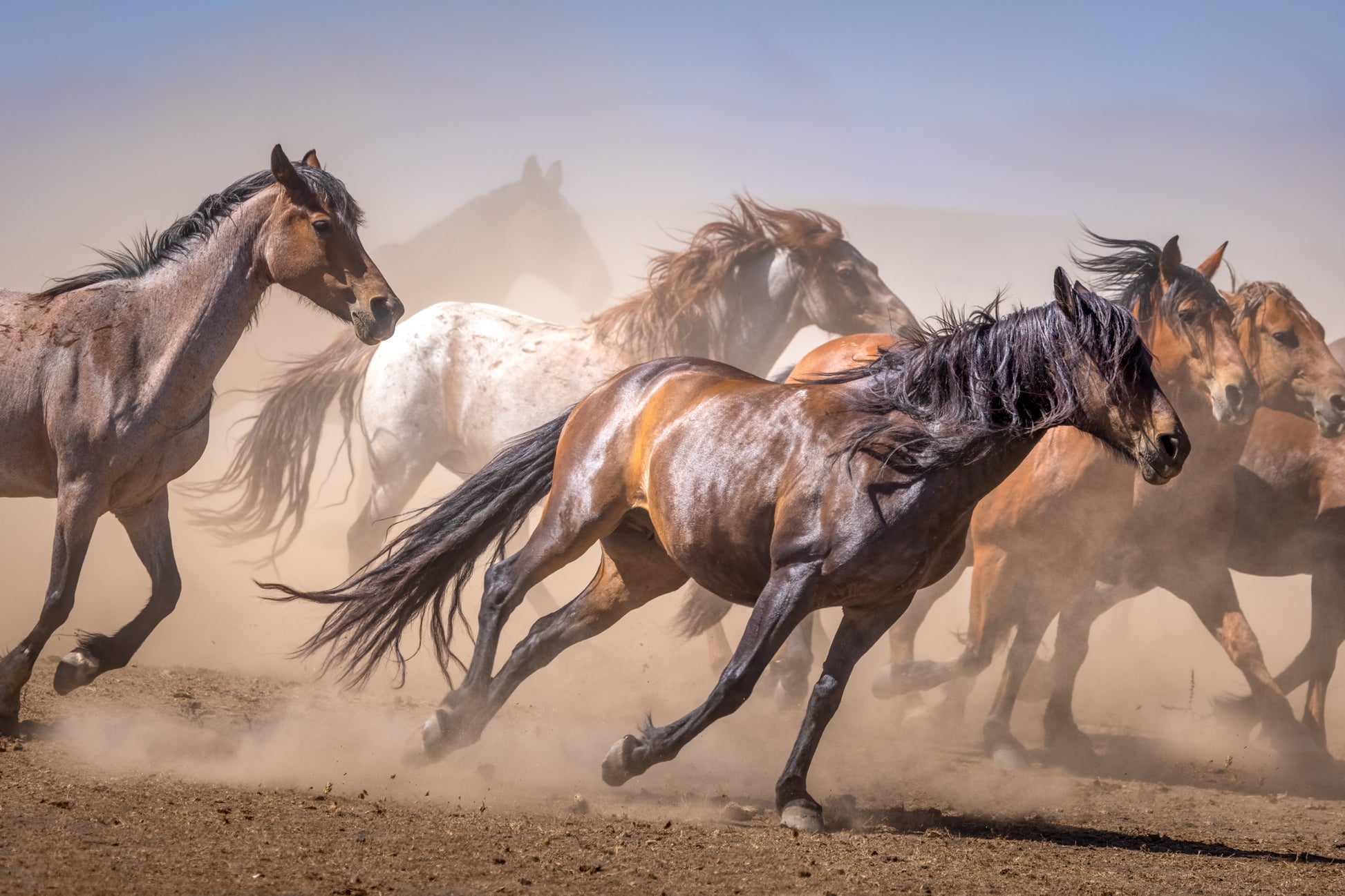 This dynamic image captures a group of wild mustangs in the midst of a spirited gallop, kicking up a cloud of dust that adds a dreamlike quality to the scene. The horses are various shades of brown, tan, and white, their coats glossy in the sunlight, accentuating their muscular builds and the sheer power behind each movement. The focus is on a dark horse in the foreground, mane and tail whipped by the wind, embodying the untamed essence of the herd. The blurred background and the haze of dust convey the swift motion and the raw energy of the scene. There's a sense of unity and freedom as these majestic animals run together, a natural spectacle of grace and strength.