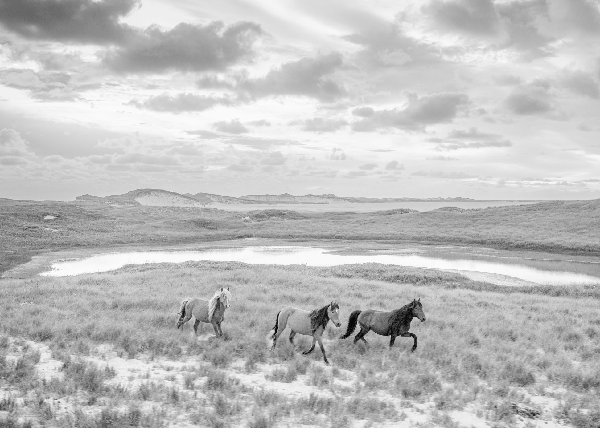 This photograph shows three wild horses moving across Sable Island’s windswept grasslands, their energy contrasting with the still water and distant dunes. The black-and-white treatment strips the scene down to form and motion, highlighting the raw spirit of the group. Image also available in brilliant color.