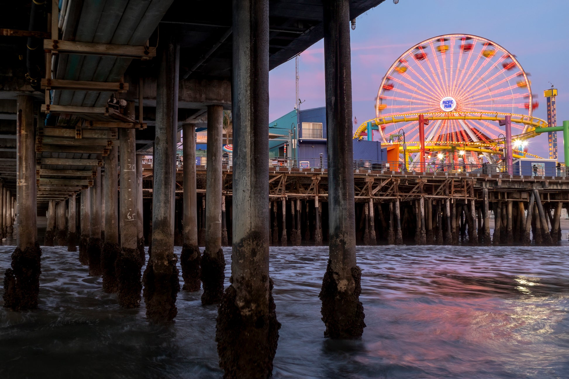 This captivating photograph reveals the Santa Monica Pier from a rarely seen perspective, highlighting the intricate details of its foundational beams. Framed by the quiet strength of the pier’s supports, the glowing Ferris wheel emerges as a burst of color and energy, contrasting beautifully with the serene blues and purples of the water and sky. The interplay of natural and man-made elements draws the viewer into the essence of coastal California’s vibrant charm.