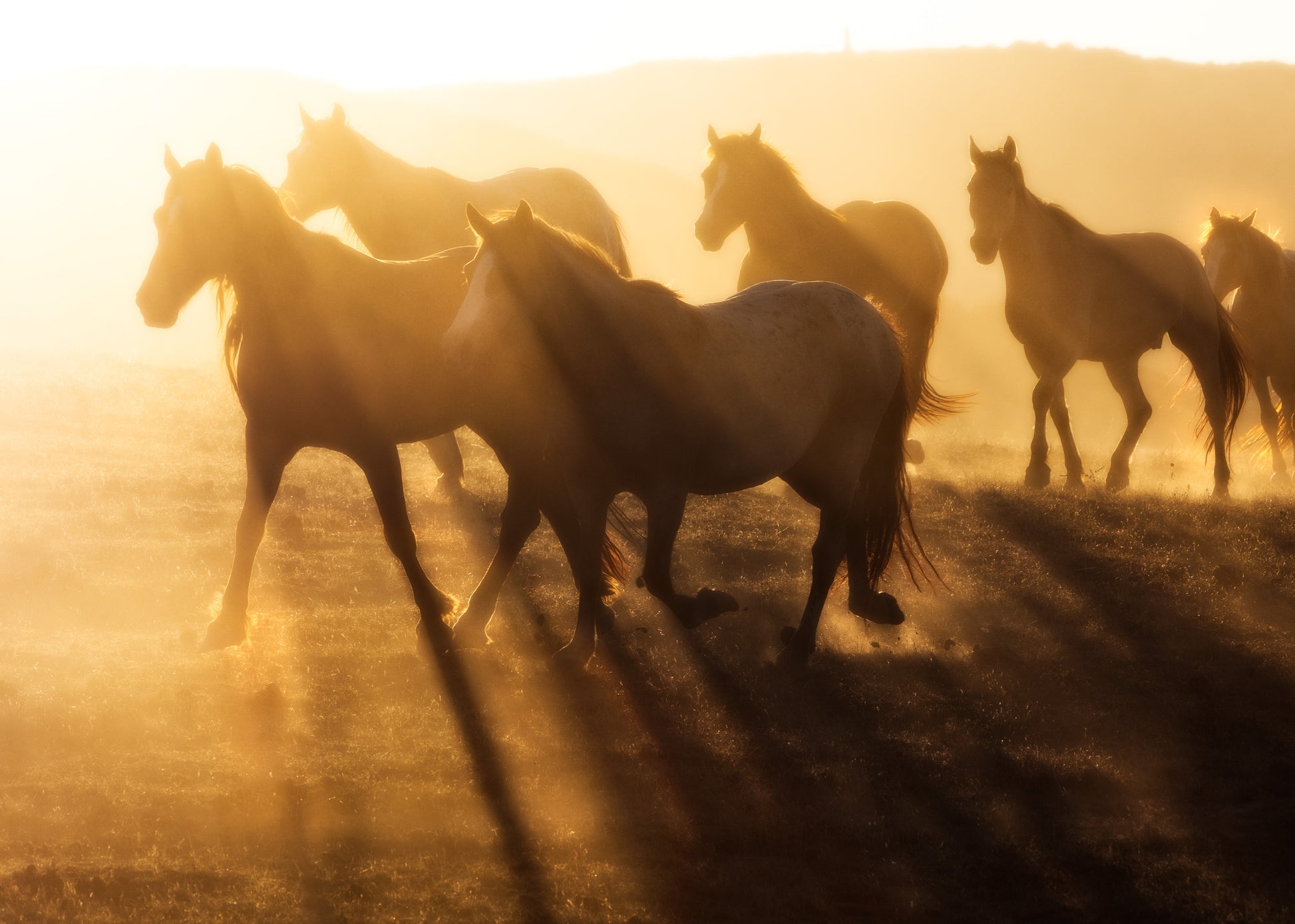 A breathtaking piece of fine art photography, this image evokes the tranquil yet powerful essence of wild horses at dusk. The warm glow of the setting sun bathes the scene in rich orange and gold tones, creating ethereal silhouettes of the horses as they move through the mist of the landscape. The delicate interplay of light and shadow casts elongated shadows that dance across the ground, adding a sense of the fleeting moments just before nightfall. Each horse is captured in mid-stride, their muscles defined against the light, symbolizing both the freedom and the silent strength of nature's creatures. This print is an exquisite addition to any collection and a must-have for those who are captivated by the wild and spirited beauty of horses in their natural habitat. Perfect for enhancing the ambiance of living spaces or as a centerpiece in a gallery.