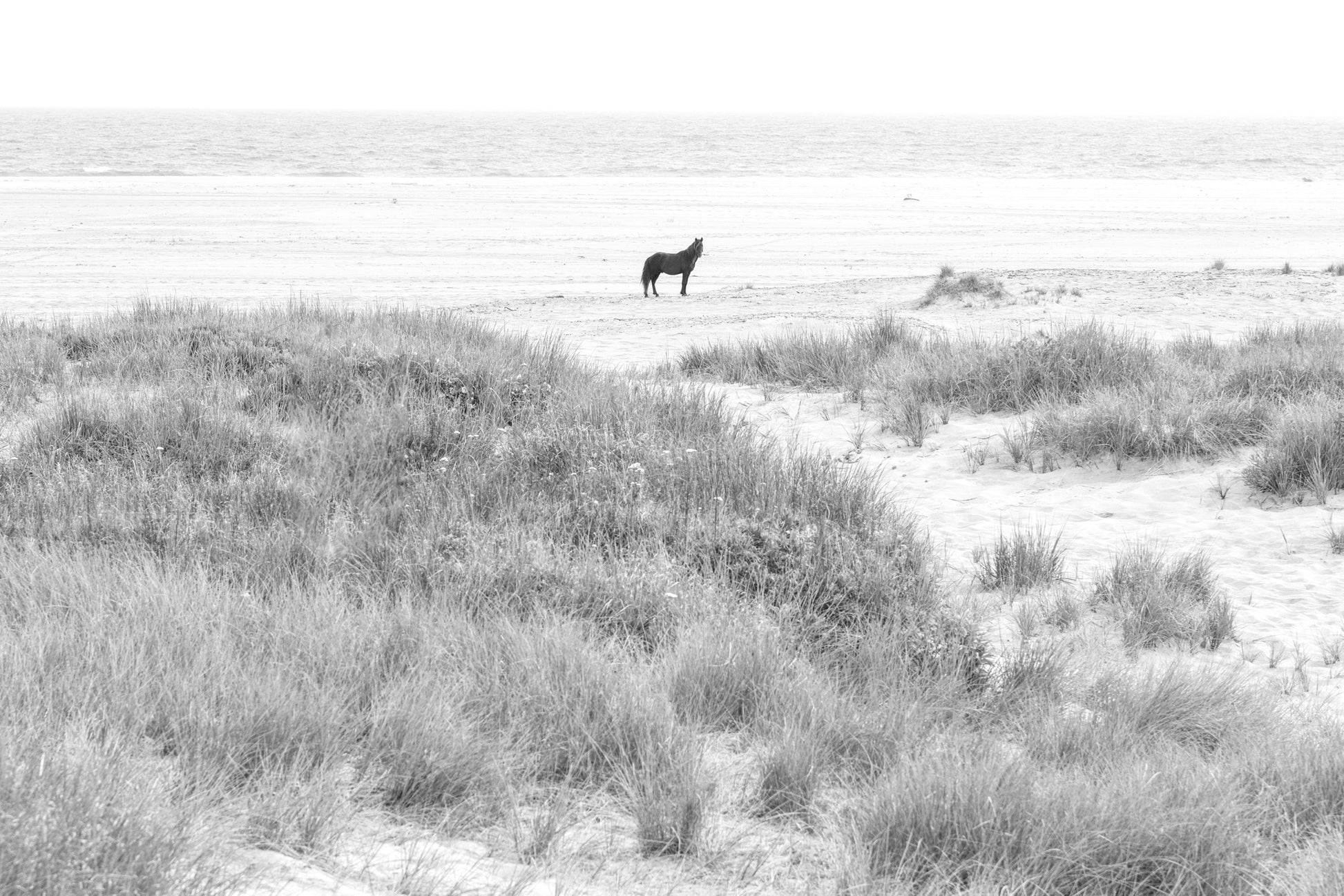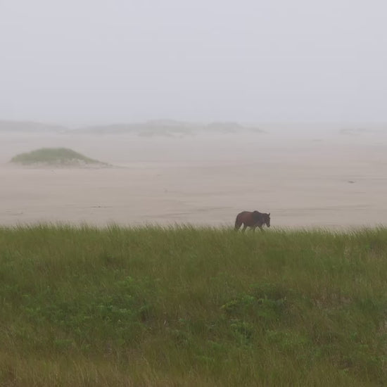 In this tranquil scene, a lone Sable Island horse stands against a backdrop of open sands and vast ocean. The minimalist composition captures the essence of solitude and freedom, with the horse as a solitary figure in an expansive landscape. The soft monochromatic tones emphasize the simplicity and beauty of this untouched environment, where nature reigns supreme and silence speaks volumes.