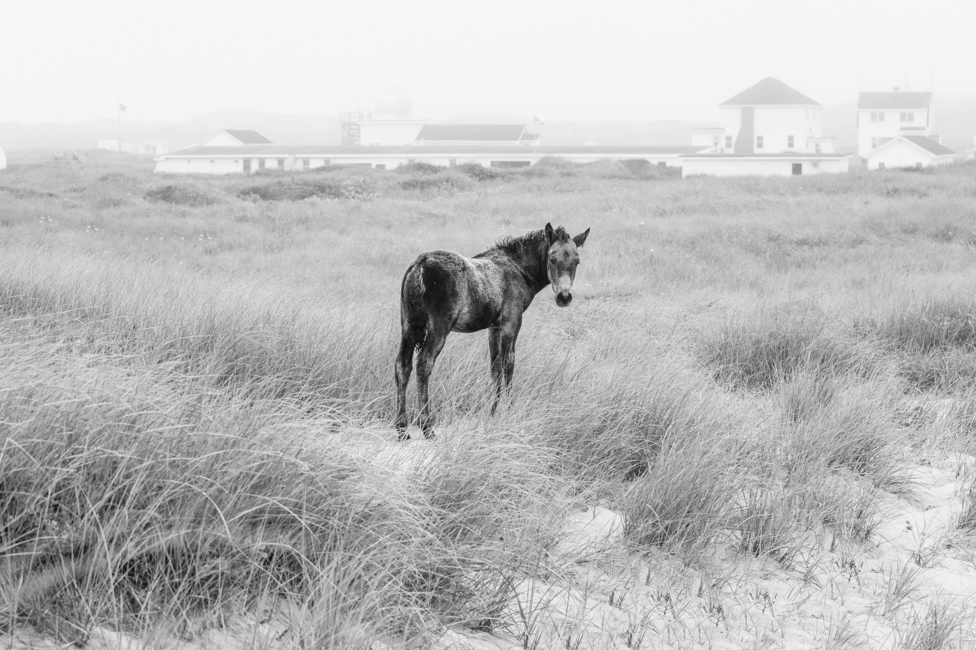 This black-and-white photograph captures a young foal on Sable Island, standing in a field of windswept grass with the iconic main station subtly visible in the background. The foal, with its gentle gaze and natural curiosity, seems both vulnerable and resilient, embodying the wild spirit of Sable Island’s untamed inhabitants. The muted tones and soft textures of the grassy landscape blend seamlessly with the overcast sky, creating a sense of quiet solitude and vastness around this young creature.