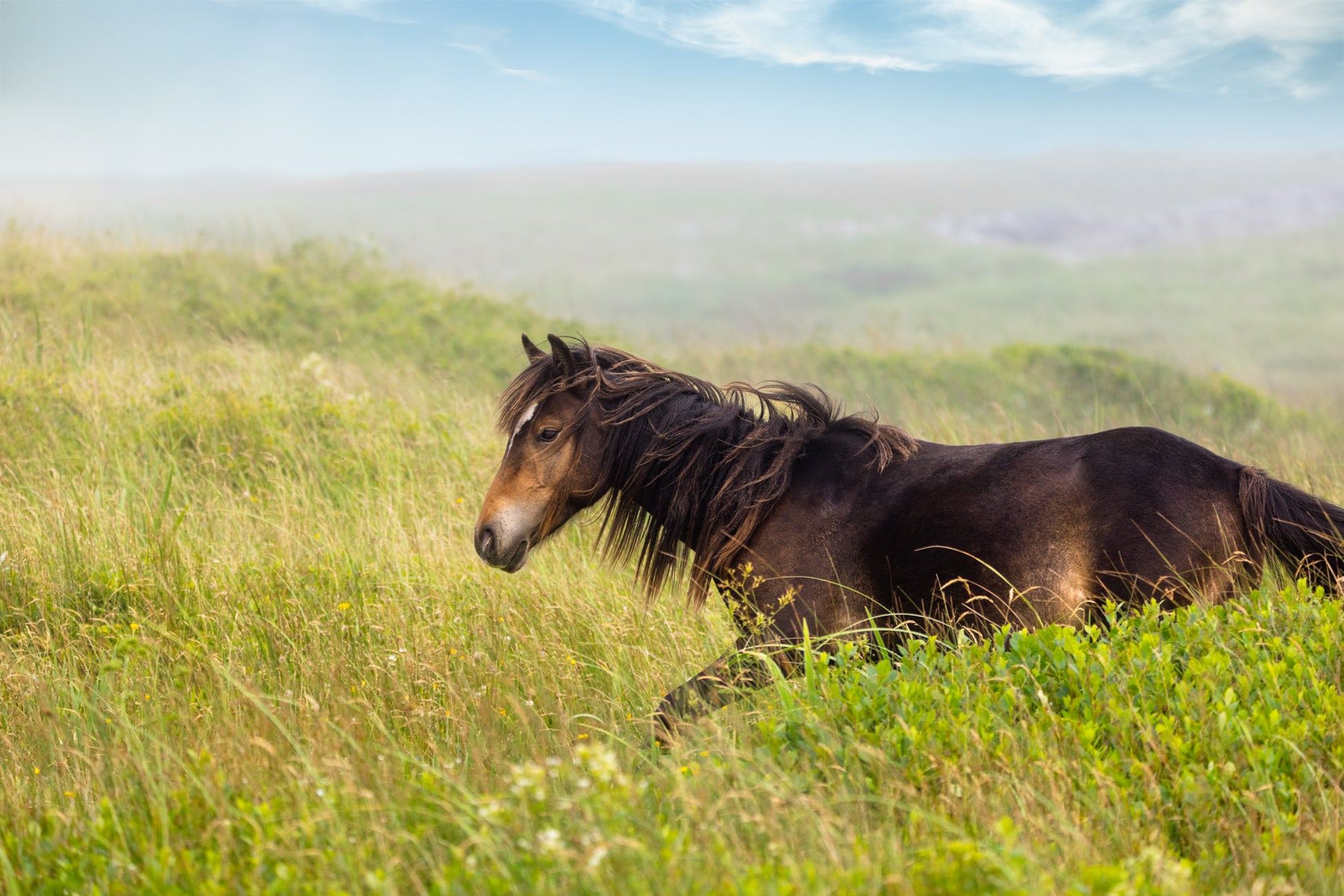 This image captures a Sable Island horse in motion, its mane flowing freely as it moves through the lush, windswept grasses. The vibrant greenery and gentle blue sky create a beautiful contrast, highlighting the horse's dark coat and powerful yet graceful form. This moment embodies the essence of wild freedom, as the horse roams its untouched landscape, exuding strength and natural beauty in every stride.