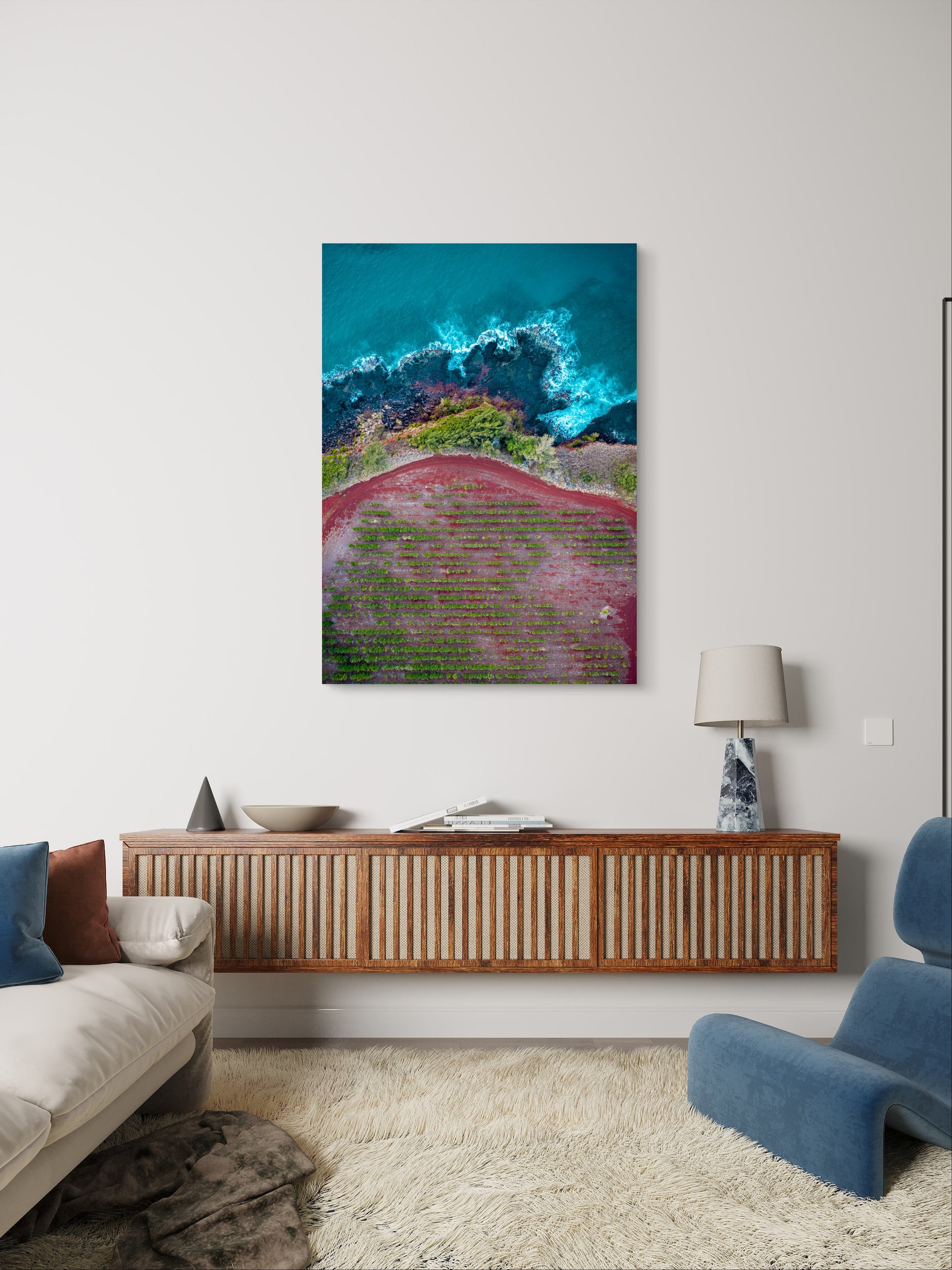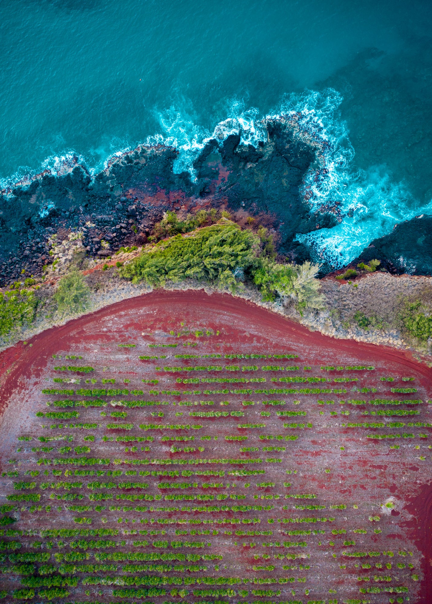 This captivating aerial image showcases Kauai’s stunning coastline, where the deep blue of the Pacific meets the vibrant red soil and lush green vegetation of the island. The patterns of cultivated plants create an eye-catching contrast against the rugged coastline, highlighting Kauai’s rich natural diversity. This photograph is a perfect choice for home or office decor, bringing the dynamic beauty of Hawaii’s landscapes indoors. Ideal for spaces that celebrate nature and color, this piece makes a bold and refreshing focal point, offering a visual journey that captures the essence of Kauai’s unique terrain.
