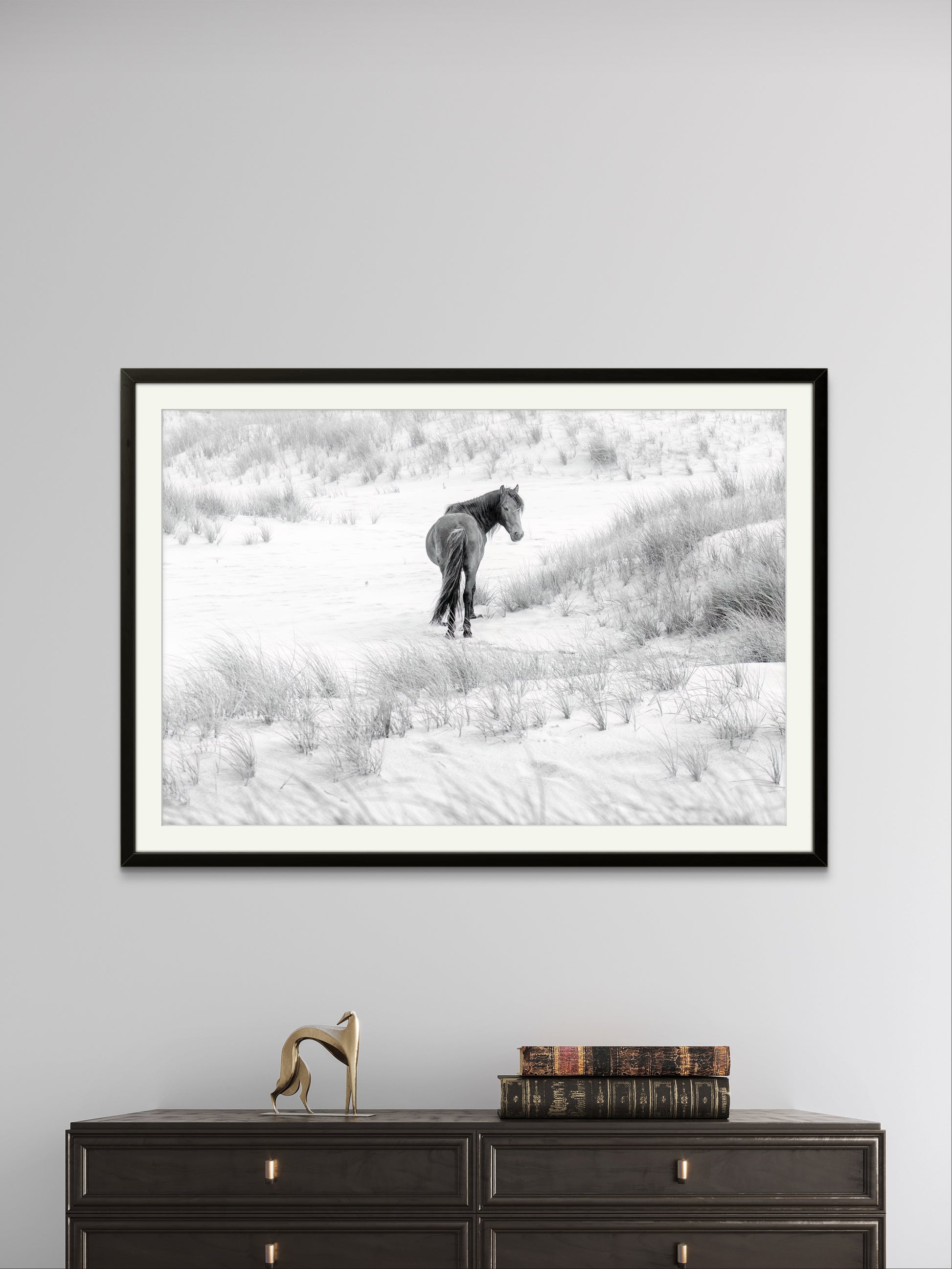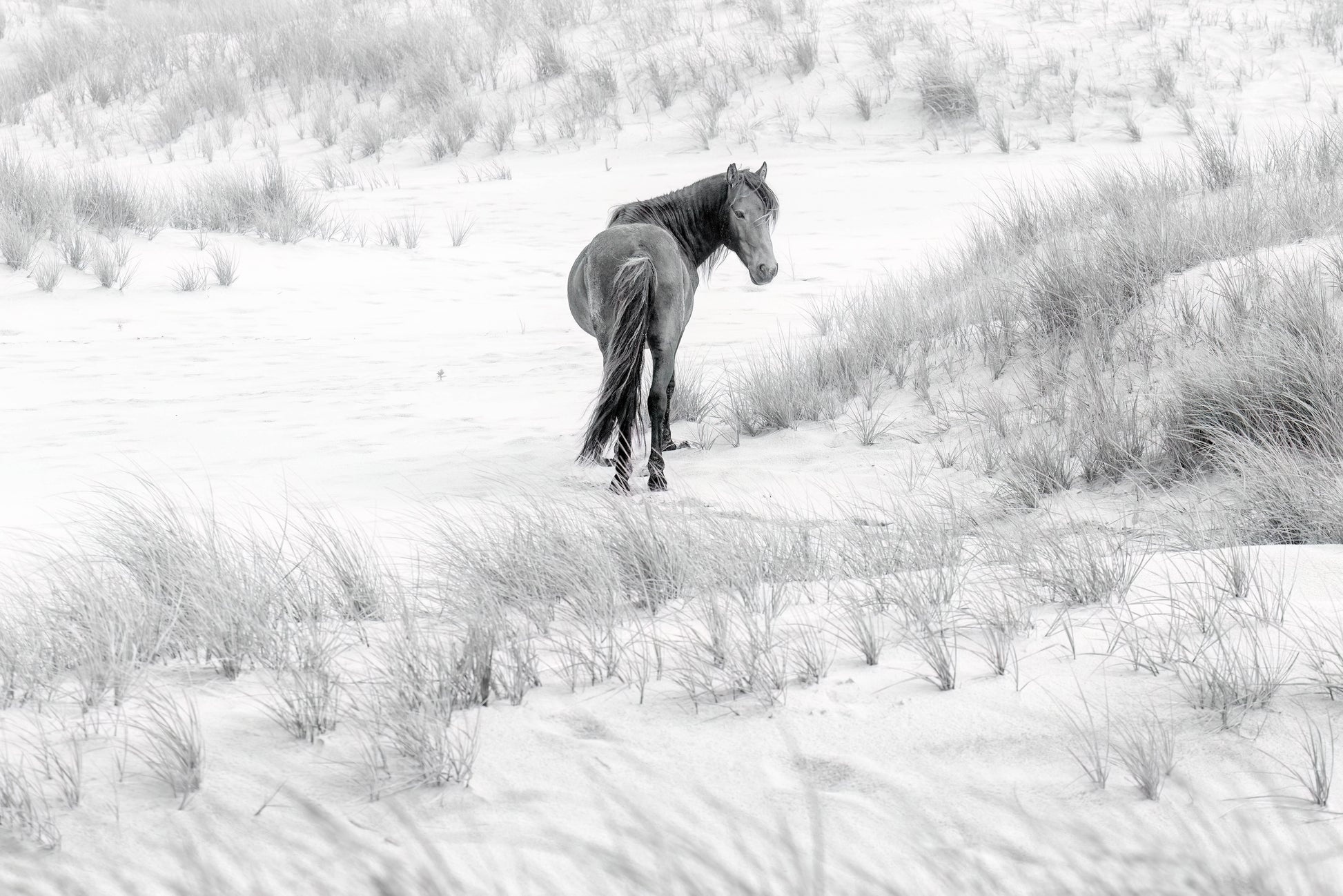 A lone Sable Island horse stands gracefully amidst the windswept dunes, gazing back with a quiet, contemplative expression. The delicate grasses frame the scene, creating a soft, frosted effect that evokes a sense of solitude and timelessness. The gentle curves of the landscape and the horse’s poised stance together capture the resilience and understated beauty of this wild environment.