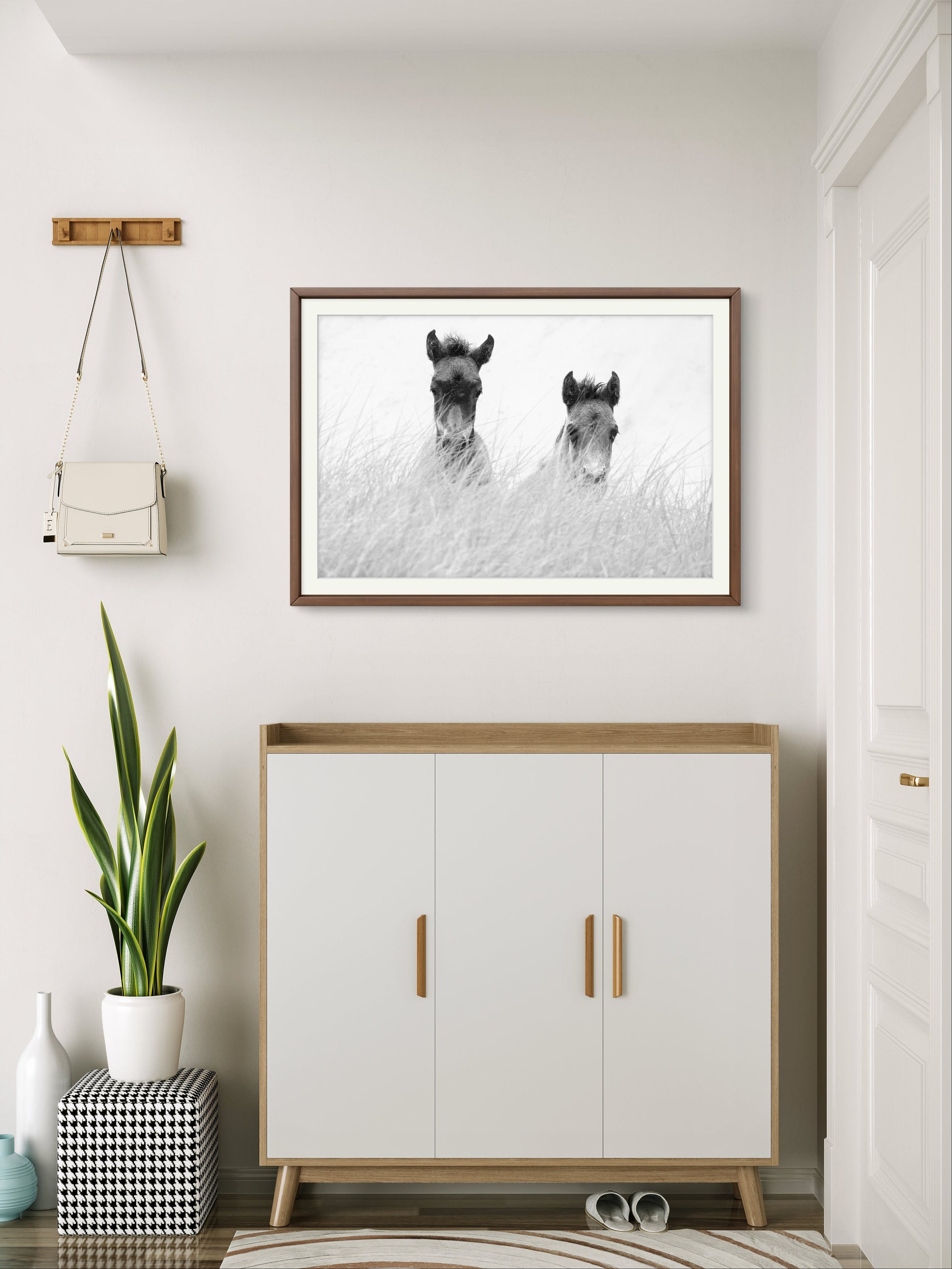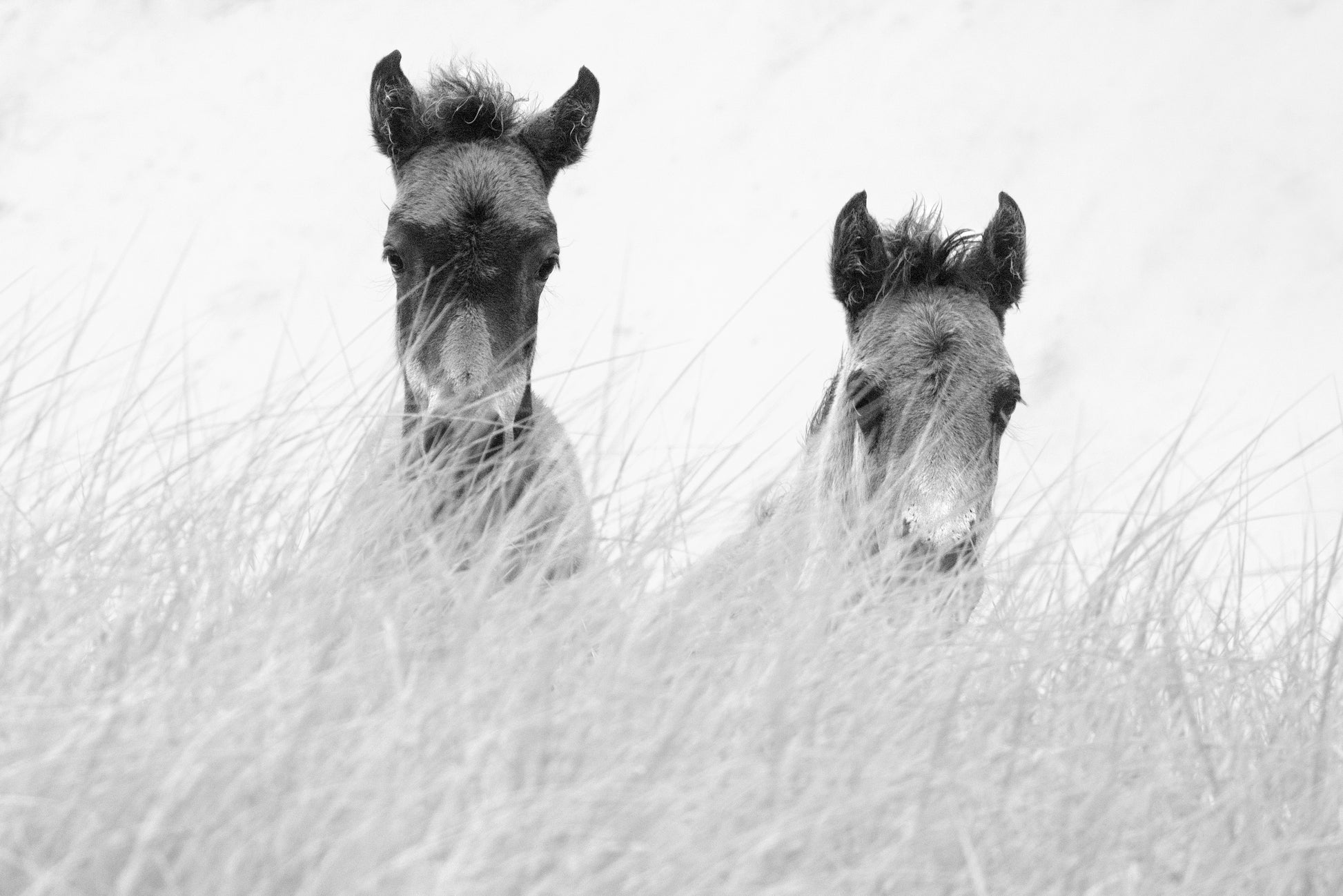 Two young Sable Island foals peer through the tall coastal grasses, their gaze both inquisitive and serene. The soft monochromatic tones highlight their delicate features, from their wispy manes to their gentle, alert expressions. This close-up view captures the essence of their bond and the unspoken curiosity shared between them as they explore the vast, untamed landscape. Set against a background of gently blurred grasses, the image conveys a timeless, peaceful moment in the lives of these wild foals.