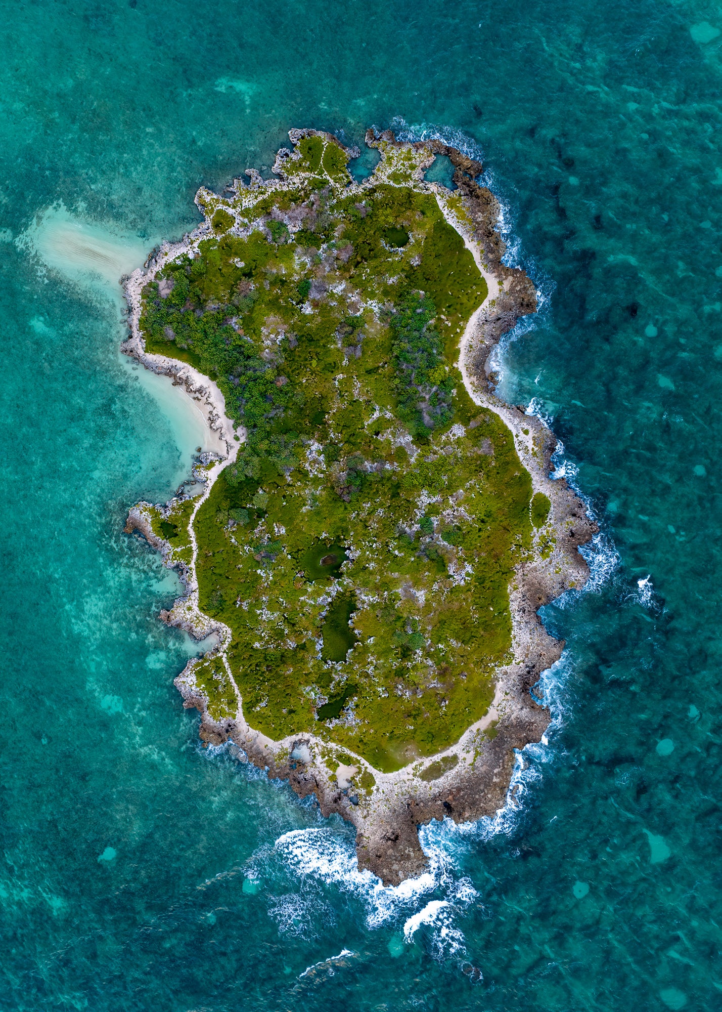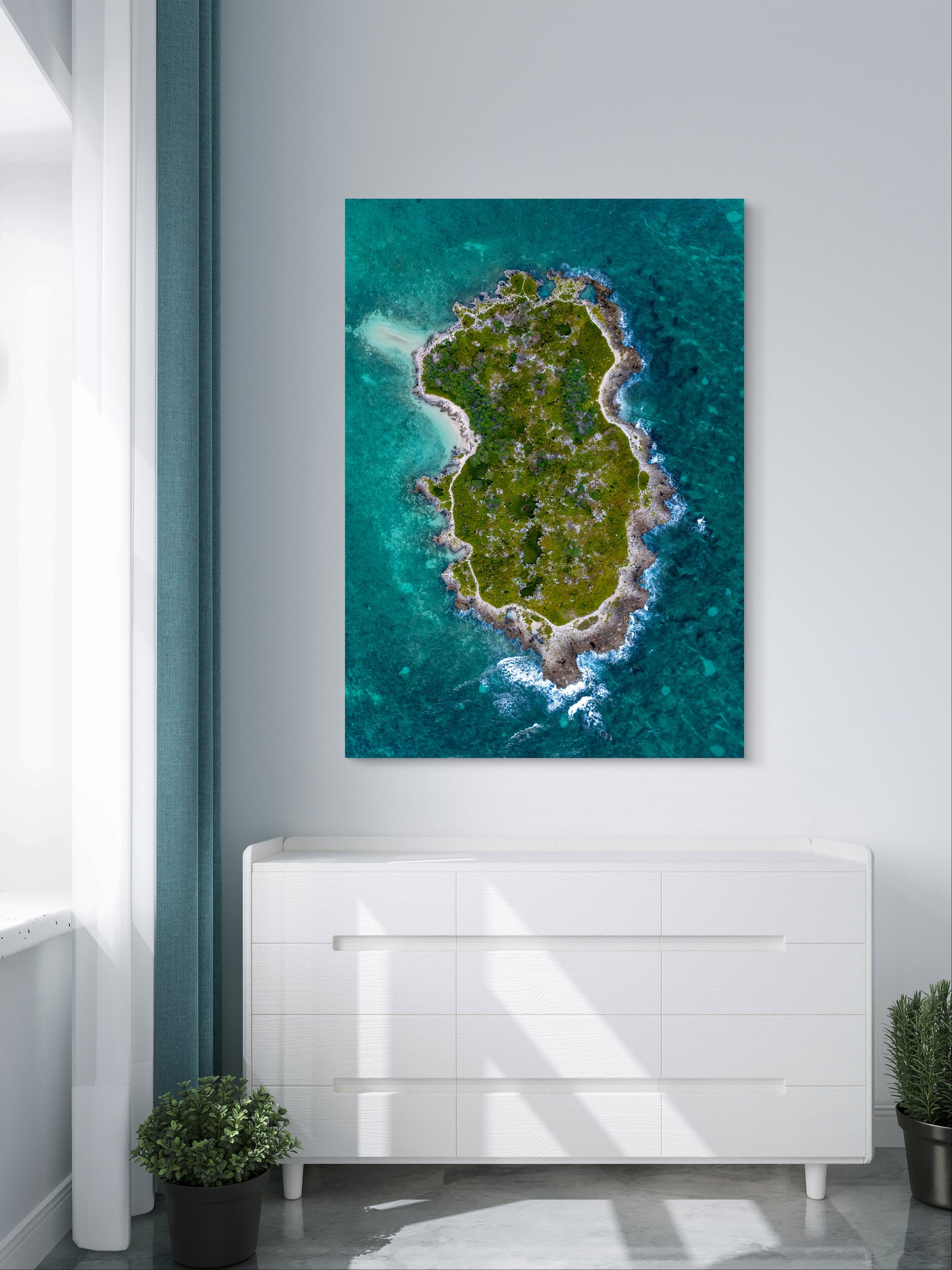 This captivating aerial photograph of Popoia Island, also known as "Flat Island," off the coast of Oahu, Hawaii, presents a stunning bird's-eye view of its unique landscape. Surrounded by the shimmering turquoise waters of the Pacific, Popoia is a small but lush island that boasts rocky coastlines, hidden sandy patches, and thriving greenery at its heart. The image emphasizes the island's seclusion and untouched beauty, capturing the essence of Hawaii's natural allure. Perfect for adding a coastal and tropical vibe to any space, this artwork brings the serenity of an isolated island paradise into homes or offices, creating a tranquil atmosphere with its vivid greens and inviting ocean blues.