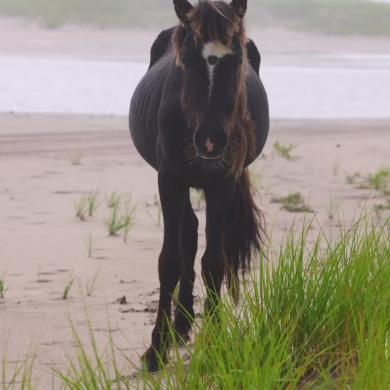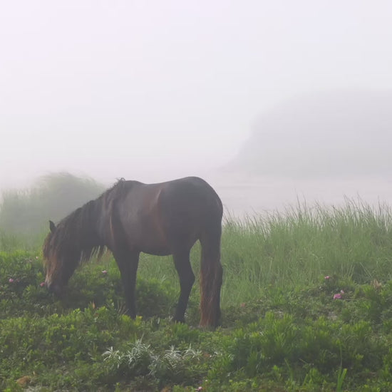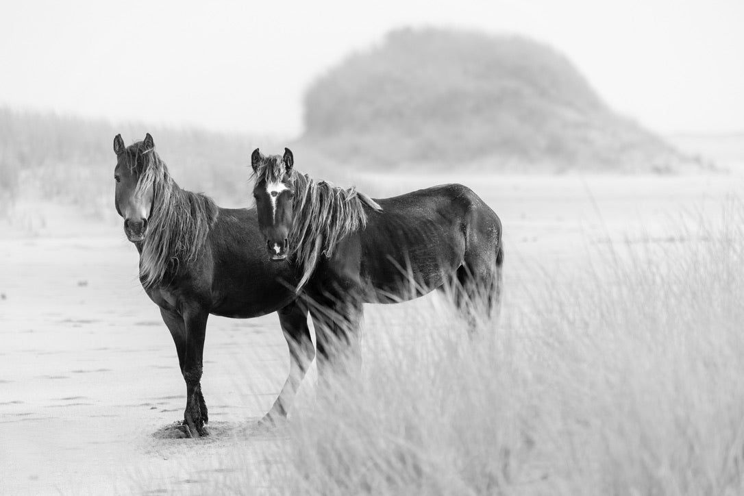 In the vast, windswept expanse of Sable Island, these two wild horses stand close, their postures and expressions suggesting an unspoken bond. The monochromatic tones emphasize the texture of their untamed manes and the raw beauty of their forms against the soft blur of the island’s sandy dunes. This image captures a rare moment of companionship in the remote wilderness, a testament to the resilience and quiet connection that defines life on Sable Island. Ideal for spaces that celebrate natural beauty and tranquility, this piece brings a sense of both strength and serenity, offering viewers a glimpse into the wild, untouched world of these majestic horses.